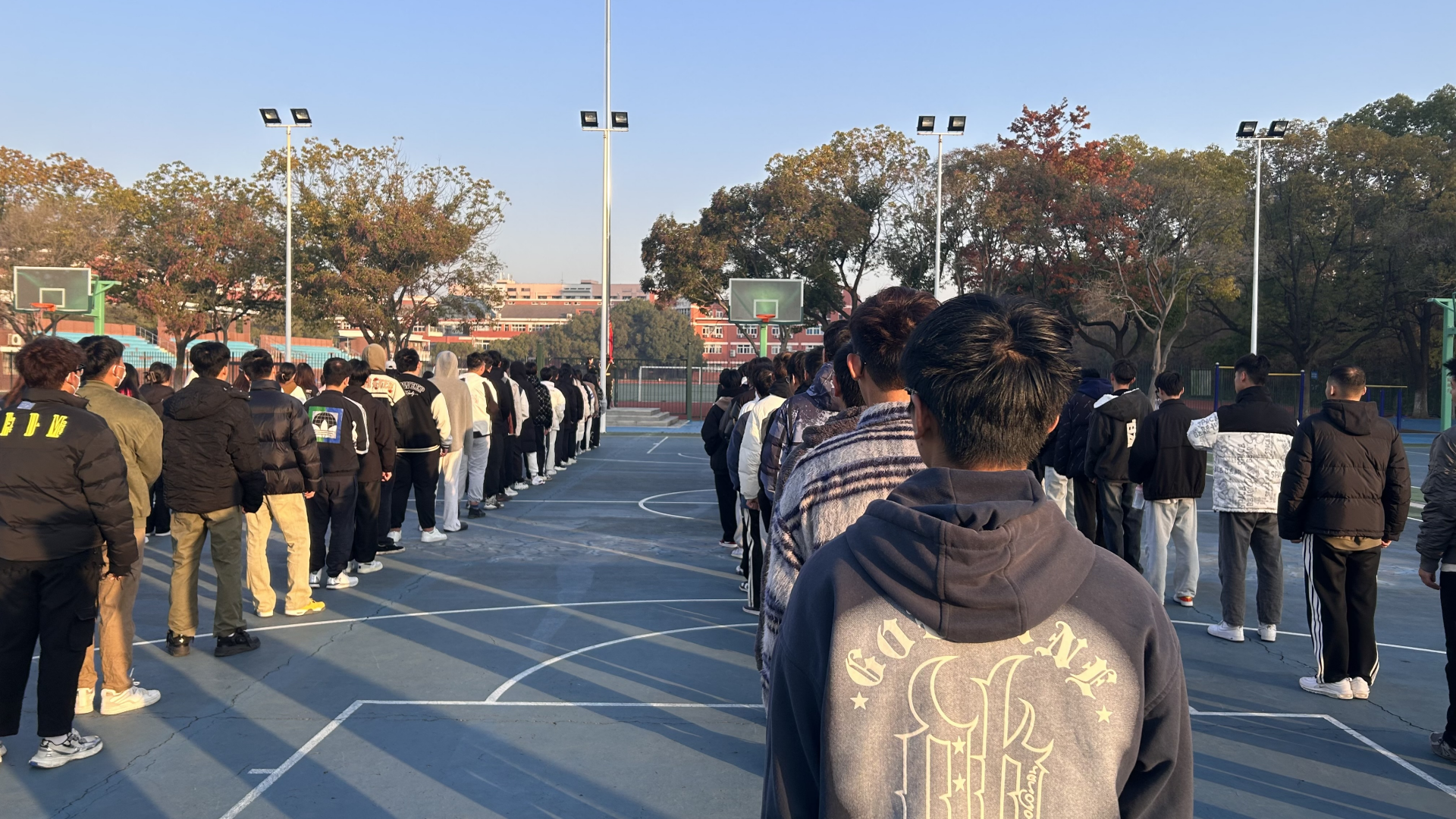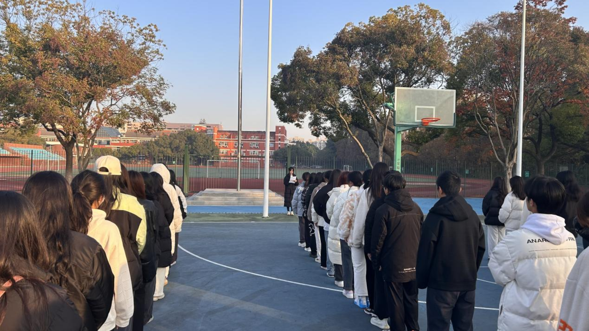 迎着冬日的晨曦,升旗仪式正式开始。伴随着高亢激越的《义勇军进行曲》,五星红旗冉冉升起,全体师生肃然而立,心怀热忱,庄严地面向国旗行注目礼。红旗迎风飘扬,师生内心激荡着对泱泱华夏的崇高敬意。