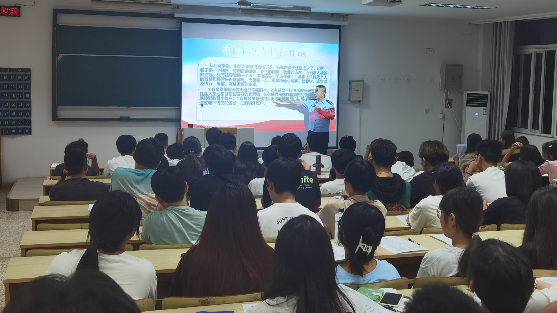 9月11日晚,学院保卫处、学生处牵头,邀请江宁开发区派出所娄军来警官走进正德学院,为2023级新生开展开学第一课———“反诈宣讲”。民用航空系作为本次活动第一站,全体新生热情高涨,课堂氛围活跃,达到了预期的效果。