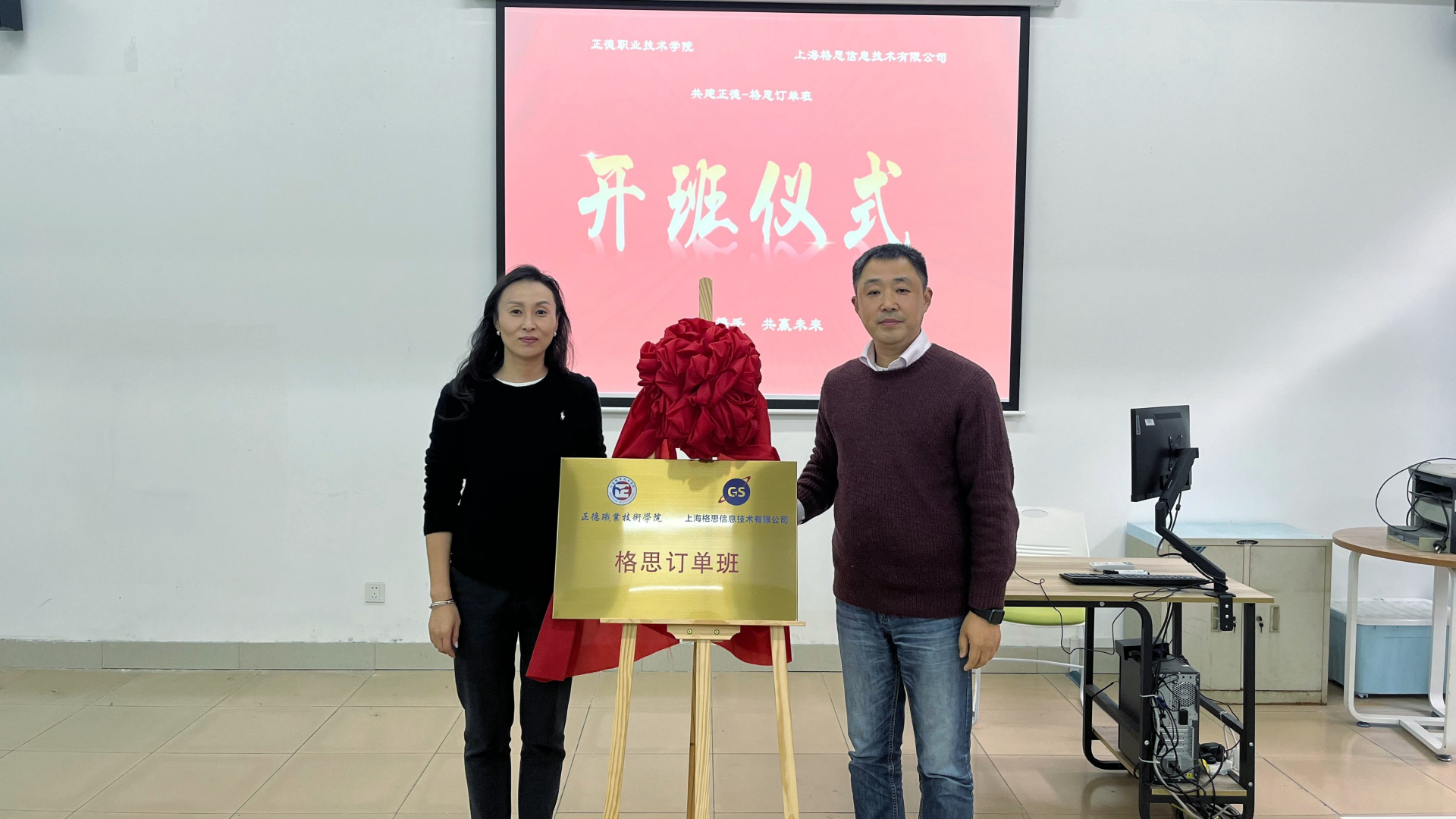 12月8日下午,av在线 与上海格思信息技术有限公司(以下简称上海格思)共建的“格思订单班”揭牌仪式在5109D教室隆重举行。上海格思装配中心副主任、中国科学院“科苑名匠”许国平、热控产品事业部汪珏、人力资源部梁蒙蒙以及学院相关部门领导、订单班学生代表一同参加此次揭牌仪式。
