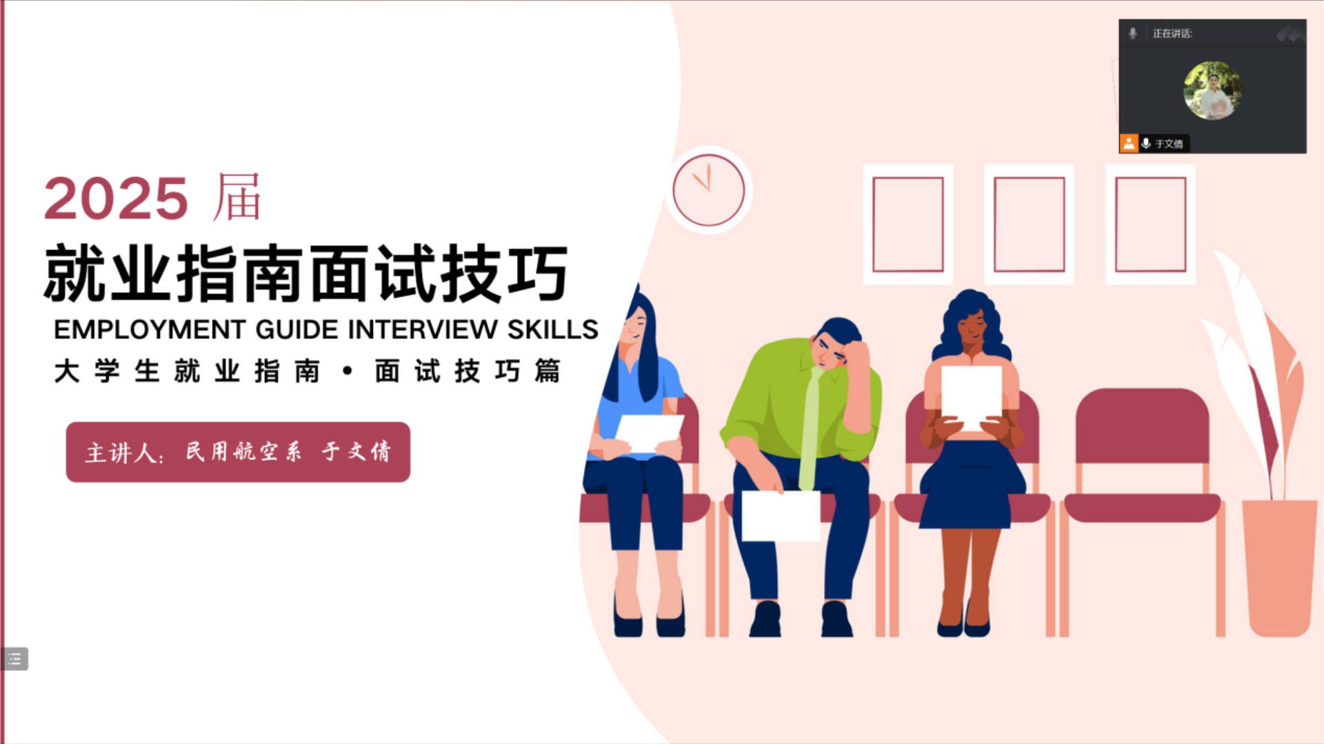 为帮助广大同学解决求职过程中遇到的疑难问题,熟知求职程序,找准自身定位,明确求职意向,提升求职能力,民用航空系举办“面试技巧培训”讲座。此次讲座以线结合的方式开展。本次讲座由民用航空系于文倩老师主持,线下到场的观众为即将毕业的 2022 级民用航空系学生。