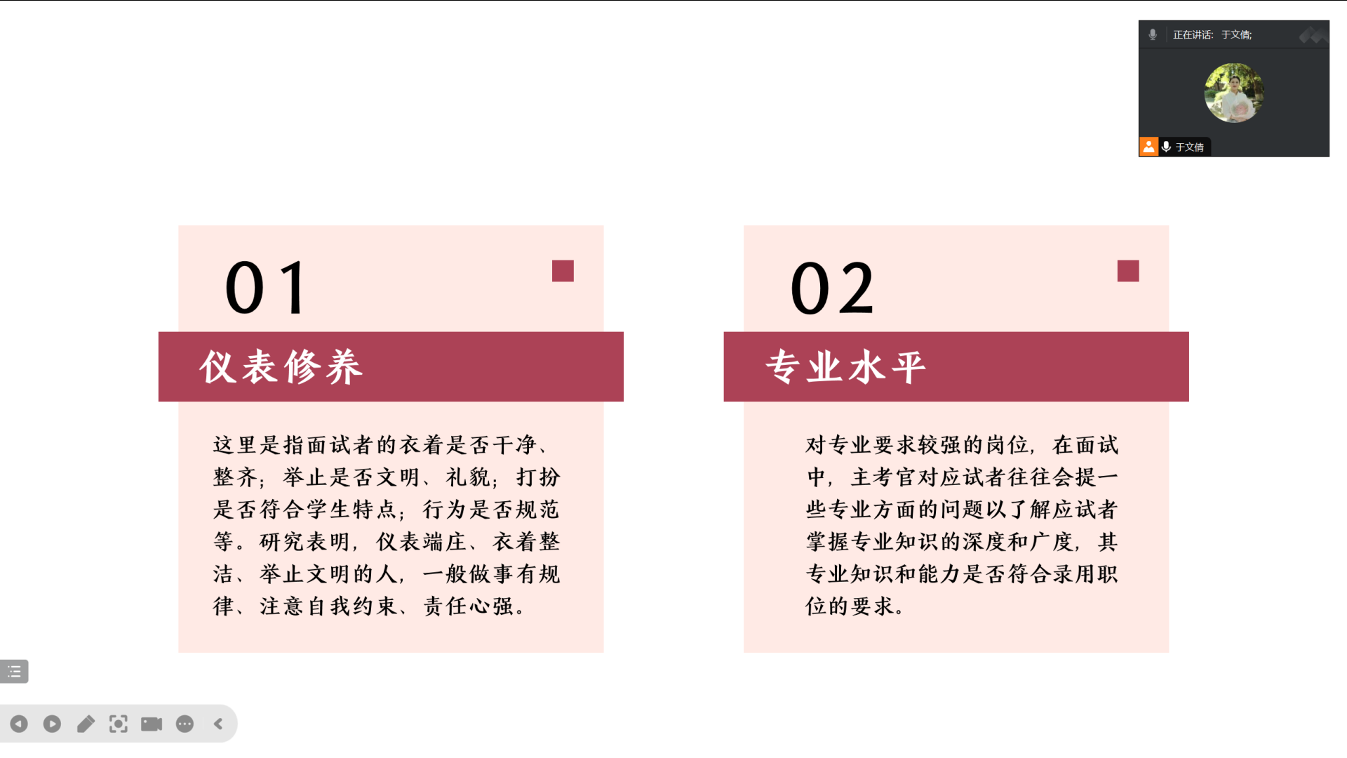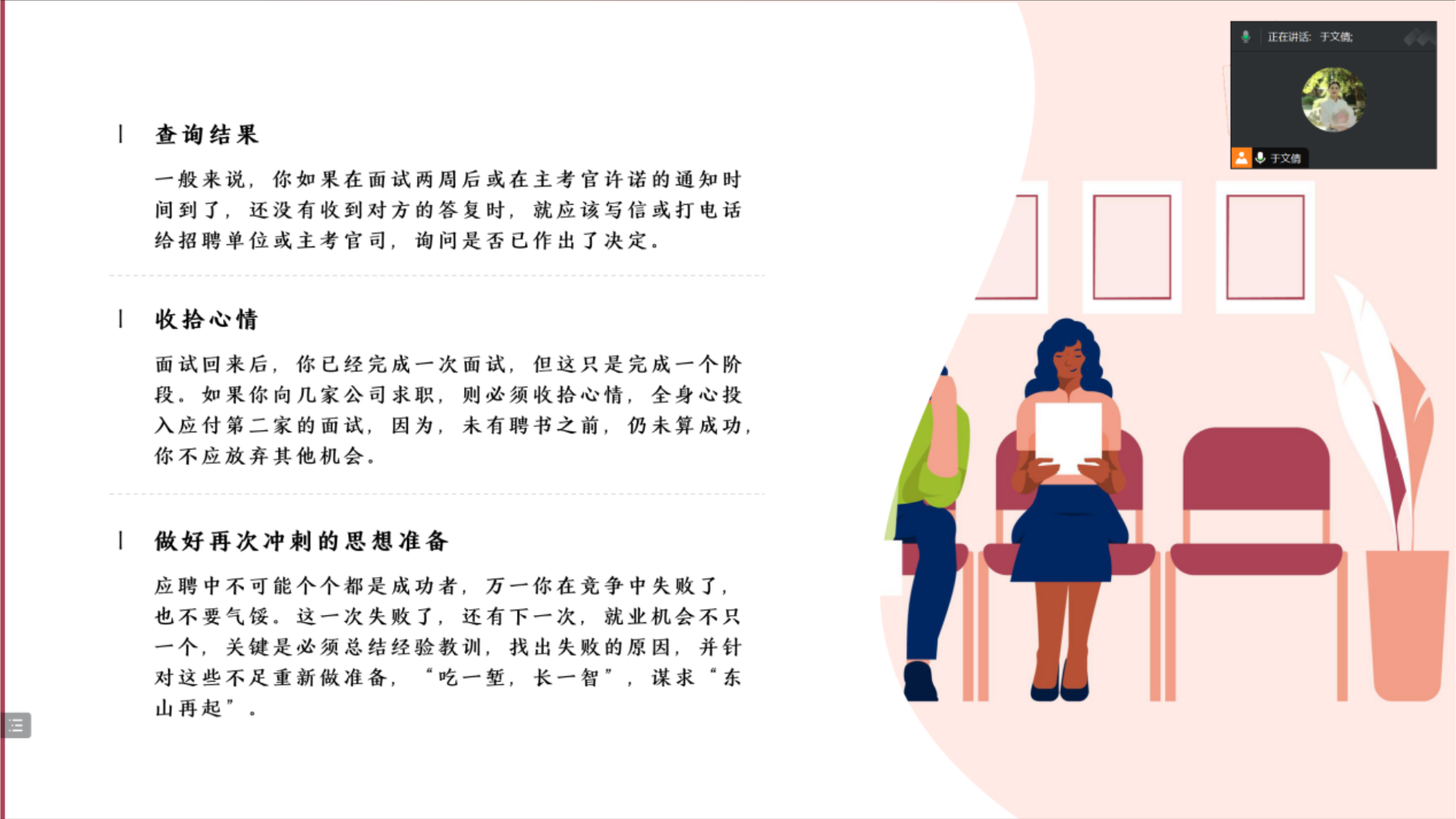 最后,于文倩老师表示我们需要具备一定的面试技巧和正确认识自己的优势,才能从竞争激烈的社会中脱颖而出,成为职场的宠儿。