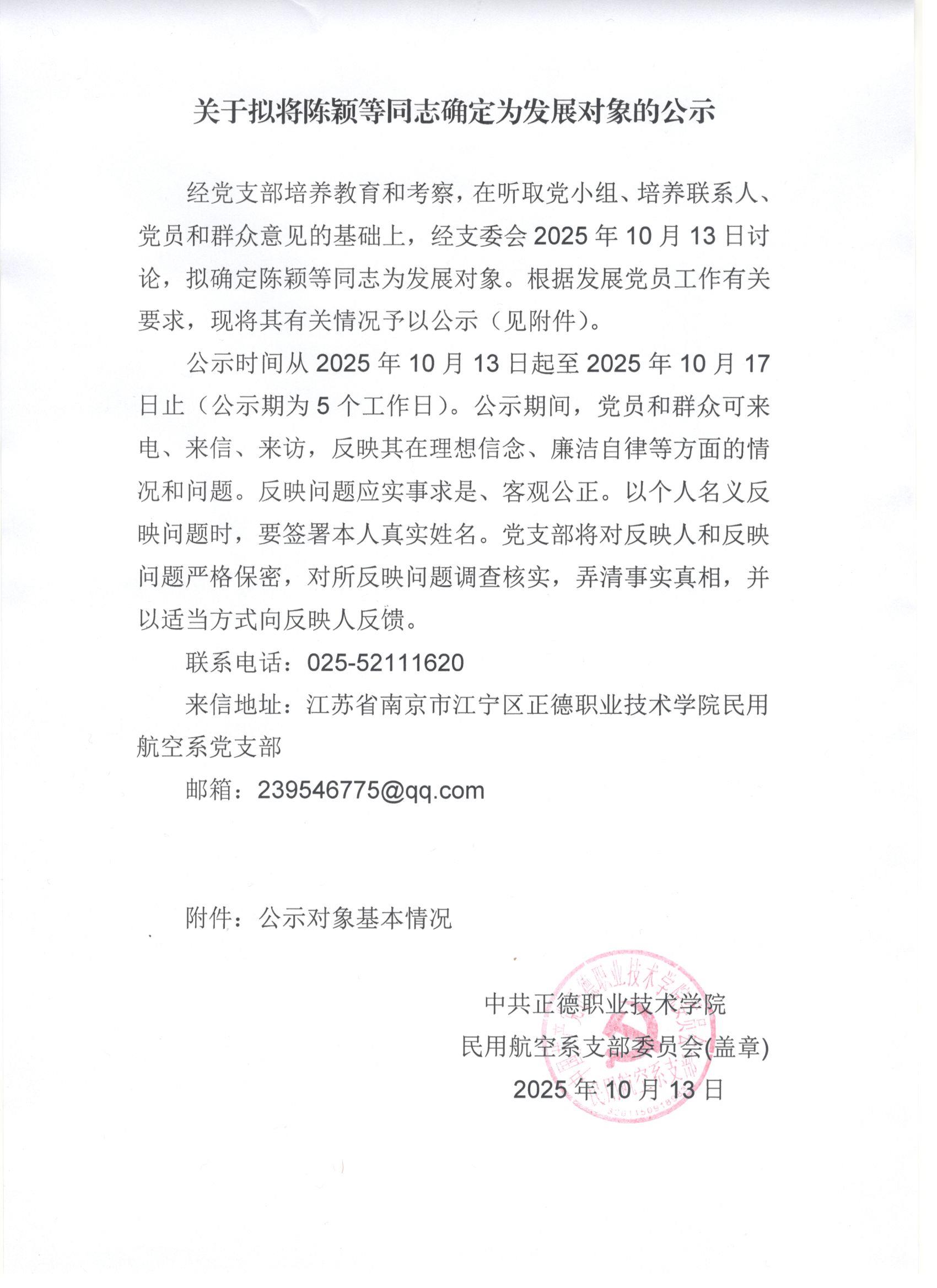 关于拟将陈颖等同志确定为发展对象的公示