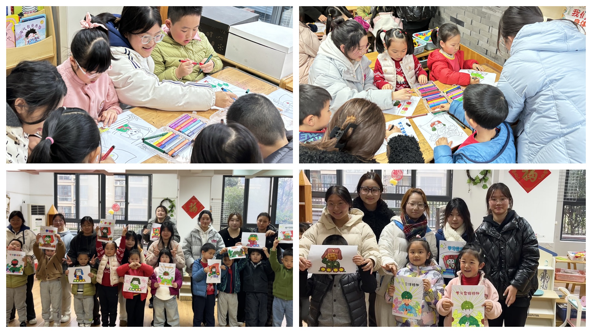 在讲解完雷锋精神的故事后,同学们和小朋友们一同来到班级的美工区,合作完成“我心中的雷锋”主题绘画。在色彩的交织中,雷锋形象在画纸上逐渐鲜活,也在小朋友们心中留下深刻印记。