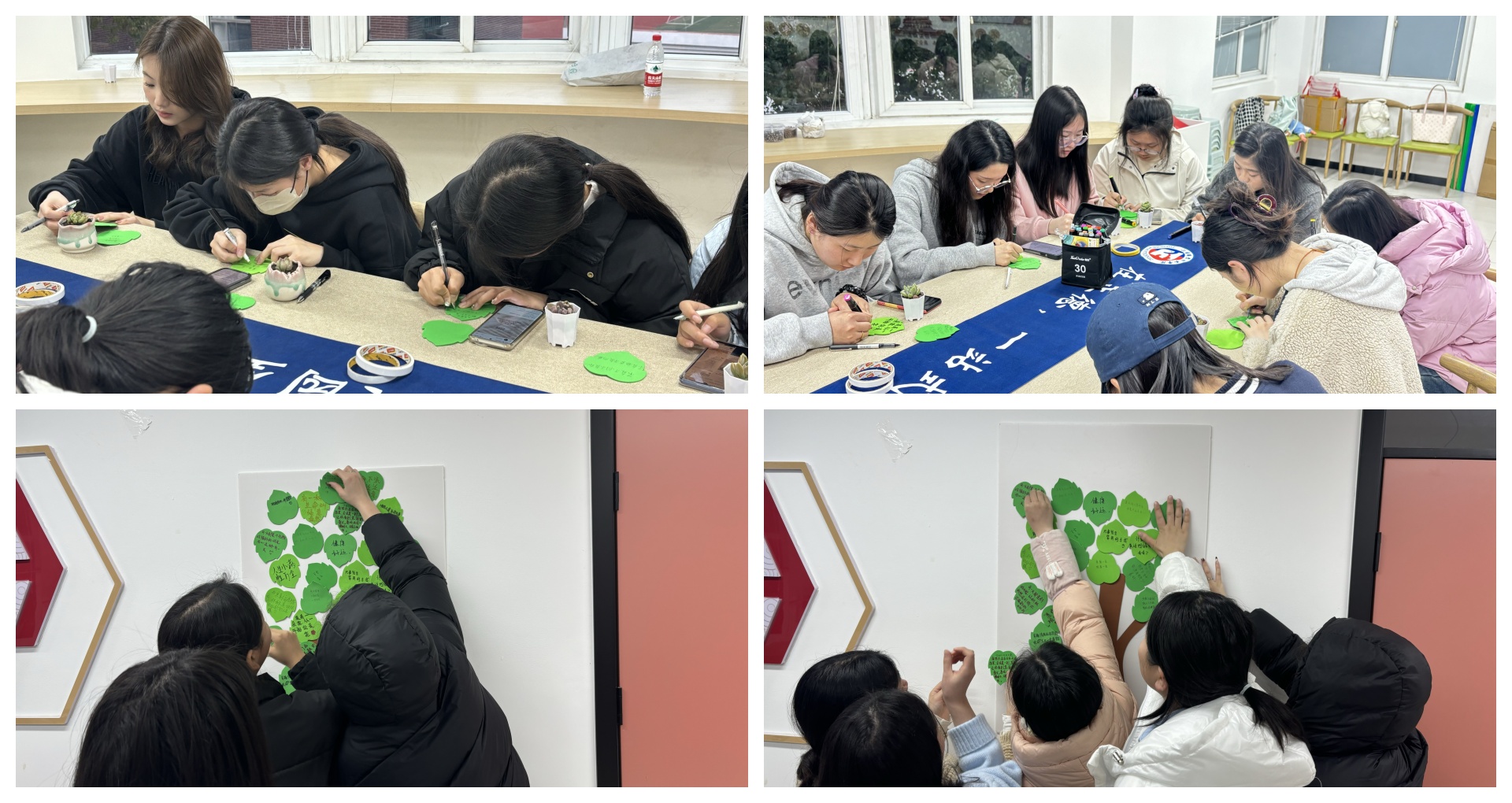 不同的树,有不同形状的叶子,一片片叶子, 组合成大树,也是五彩斑斓的春天!第二项活动是“植”得期待,每个同学在树叶状的便签上写下自己的期盼,用植树节的生机盎然,激励自己在这个春天为后续的梦想耕种。一片片愿望的树叶,组成了这颗繁茂无比的愿望树,增添了别样的风景。
