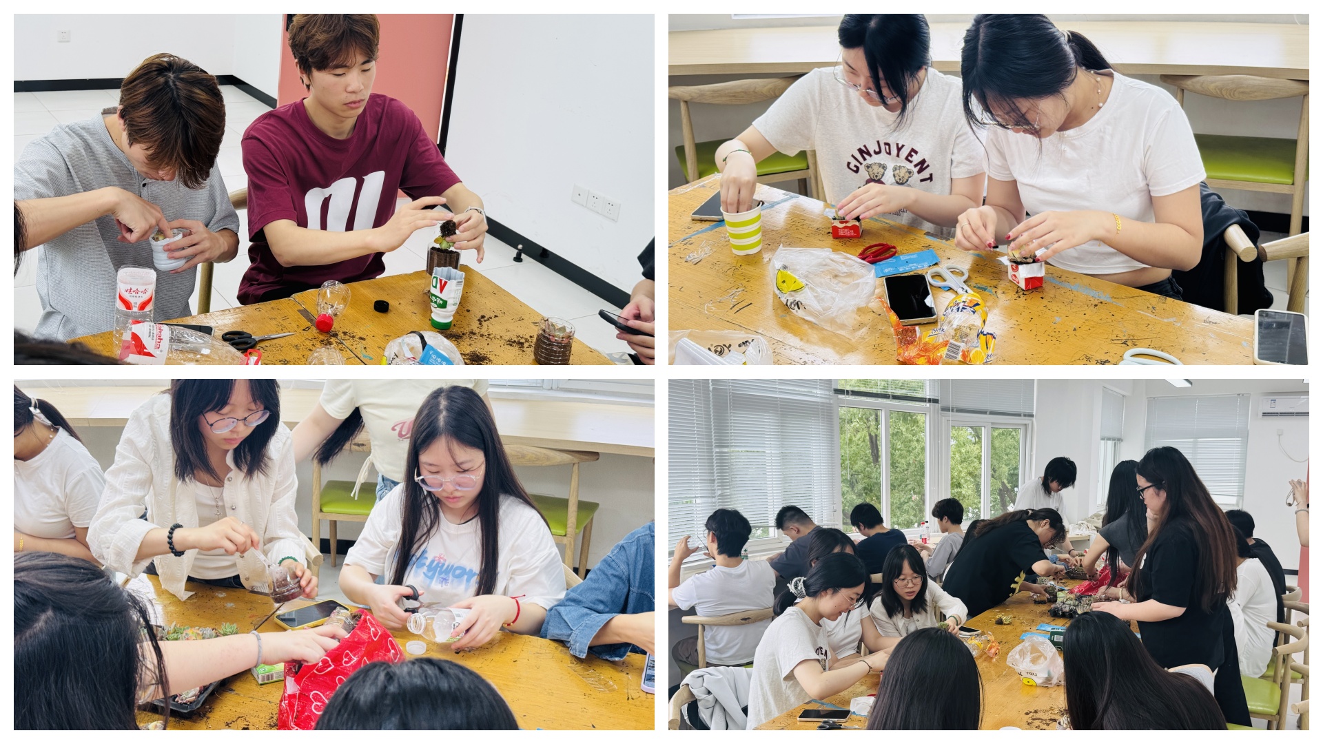 随后,活动在一站式社区继续展开。同学们携带提前收集的矿泉水瓶、易拉罐等废旧物品来到现场,这些原本将被丢弃的瓶罐,在此次活动中成为创作的主角。现场准备了多肉植物、种植土壤等材料,为“变废为宝”的创意实践提供了坚实基础。