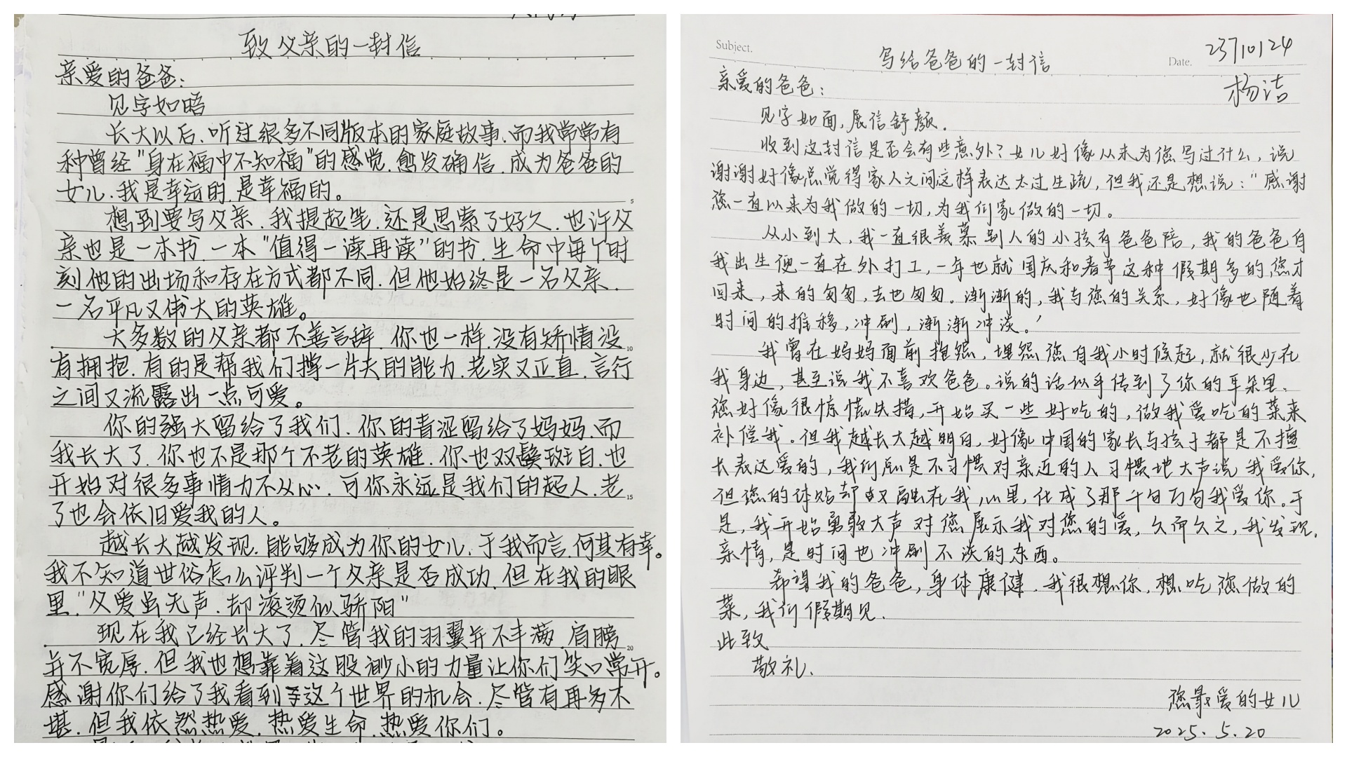 纸短情长诉心声,拿起笔,将平日里羞于说出口的心里话,化作文字,写进一封封书信里。信中,有对父亲辛苦工作的心疼,有对儿时父亲陪伴的怀念,还有对未来与父亲携手同行的期待。一行行字迹工整的书信里,同学们放下羞于当面表达的情感,将成长中的感悟、对父亲的愧疚与爱意诉诸笔尖。不少同学表示,平时与父亲交流较少,这次活动让他们重新审视亲情,学会用文字传递温暖。