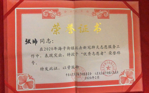 疫情期间,张沛同学自发组织起了在家乡的大学生们,成立了七星关区海子街镇大学生防疫志愿者服务队,承担起协助当地政府设立卡点,对来往人员进行登记检测的任务。他们走村串巷向乡亲们宣传讲解防疫的有关知识,并对路上出来玩乐的行人进行劝解,引导当地居民提高防护意识。服务队还协同当地社区工作人员创建了海子街镇十户联动群,面对一些乡亲不理解不支持工作开展的情况下,他没有放弃、没有叫苦,而是一遍又一遍的耐心讲解,用自己的行为感染身边的每一个人,使大家感受到了这支大学生志愿者队伍所迸发出来的力量,收到了当地政府和群众的赞誉。