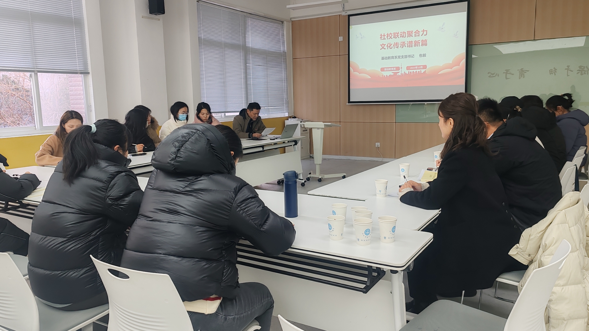 基础教育系党支部书记包毅以“社校联动聚合力,文化传承普新篇”为主题,围绕习近平总书记在文化传承发展座谈会上的讲话精神,从中华文明的突出特性、“两个结合”的重大意义、担负起新的文化使命三块内容进行了领学,并结合“书记项目”的育人机制、育人路径、育人效果进行了分享交流。