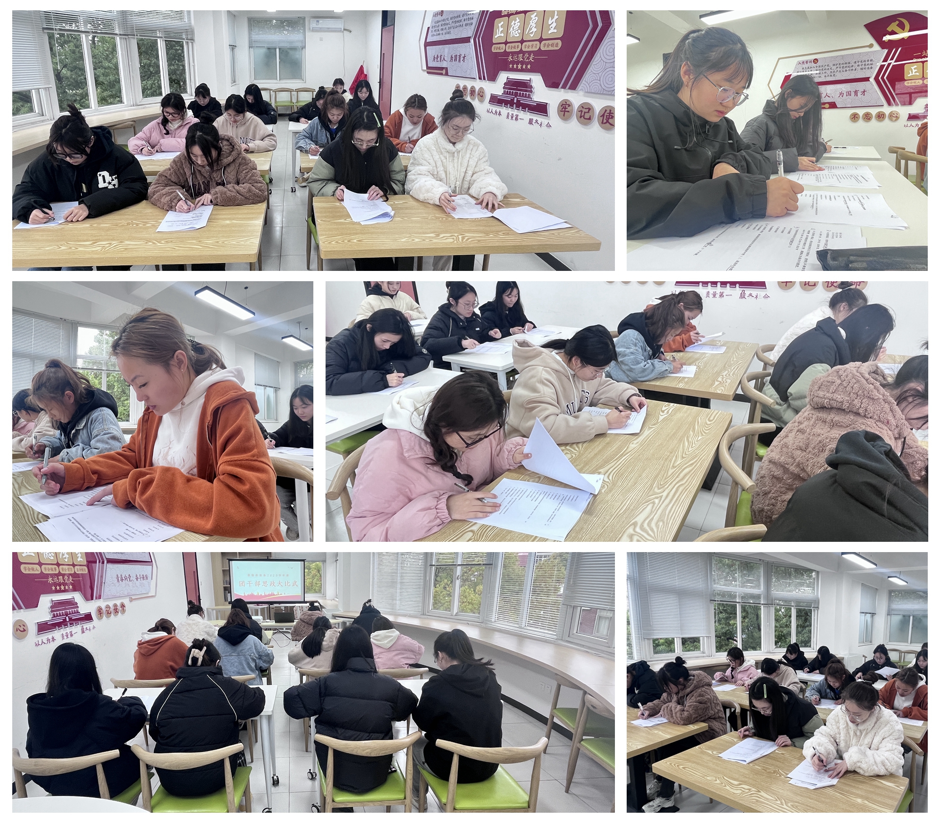第一轮为理论考试。理论考试的题型包括单选、多选、填空、简答和论述,考试形式为闭卷考试,考试内容围绕中党的二十大报告基础知识、党章、团章基础知识等。主要考查选手们对党团知识的学习和掌握情况。考场上,同学们耐心作答,细致填写,争取荣获优异的笔试成绩。