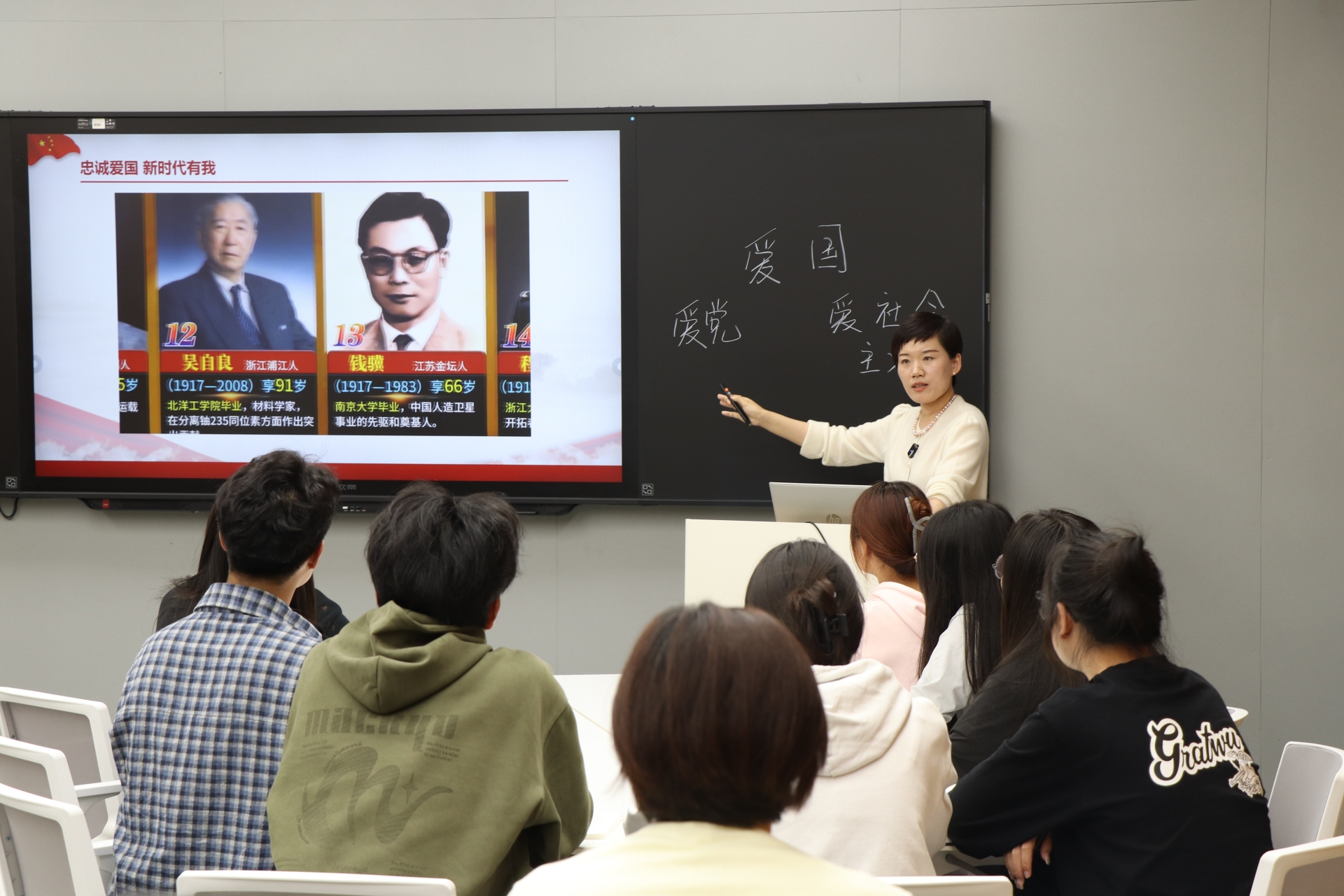 公共教学部戴晗越和杨俊老师现场观摩了课程,他们表示李颖老师以爱国引入话题,循序渐进,由浅入深引发同学发散思考,提升学生学习热情;通过课堂互动,让学生深入思考;从历史和现实维度的统一描述爱国性质,爱国是具体的,不是抽象的。从历史和现代的角度,以国家新闻、历史影片的方式,从国家的发展论证社会主义具有不可比拟的优越性。