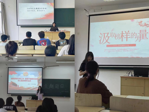 在本次主题活动周的末期,214703班团支书周涵向每班团支书开展了一次有深度的团课。讲述在党的百年历史中产生的风云英雄人物,讲述到“我们作为当代青年,如何在时代的变迁和社会的格局面前活得有价值,有意义?”这是值得我们思考的,前辈给我们树立好人生标杆,我们要向前辈们学习。在团课结束厚,各班团支书重温入团誓词,让团支书们牢记初心、使命,作为新时代的广大青年,我们应坚定理想信念,将国家使命与个人的人生价值相结合,在各种考验中砥砺前行。