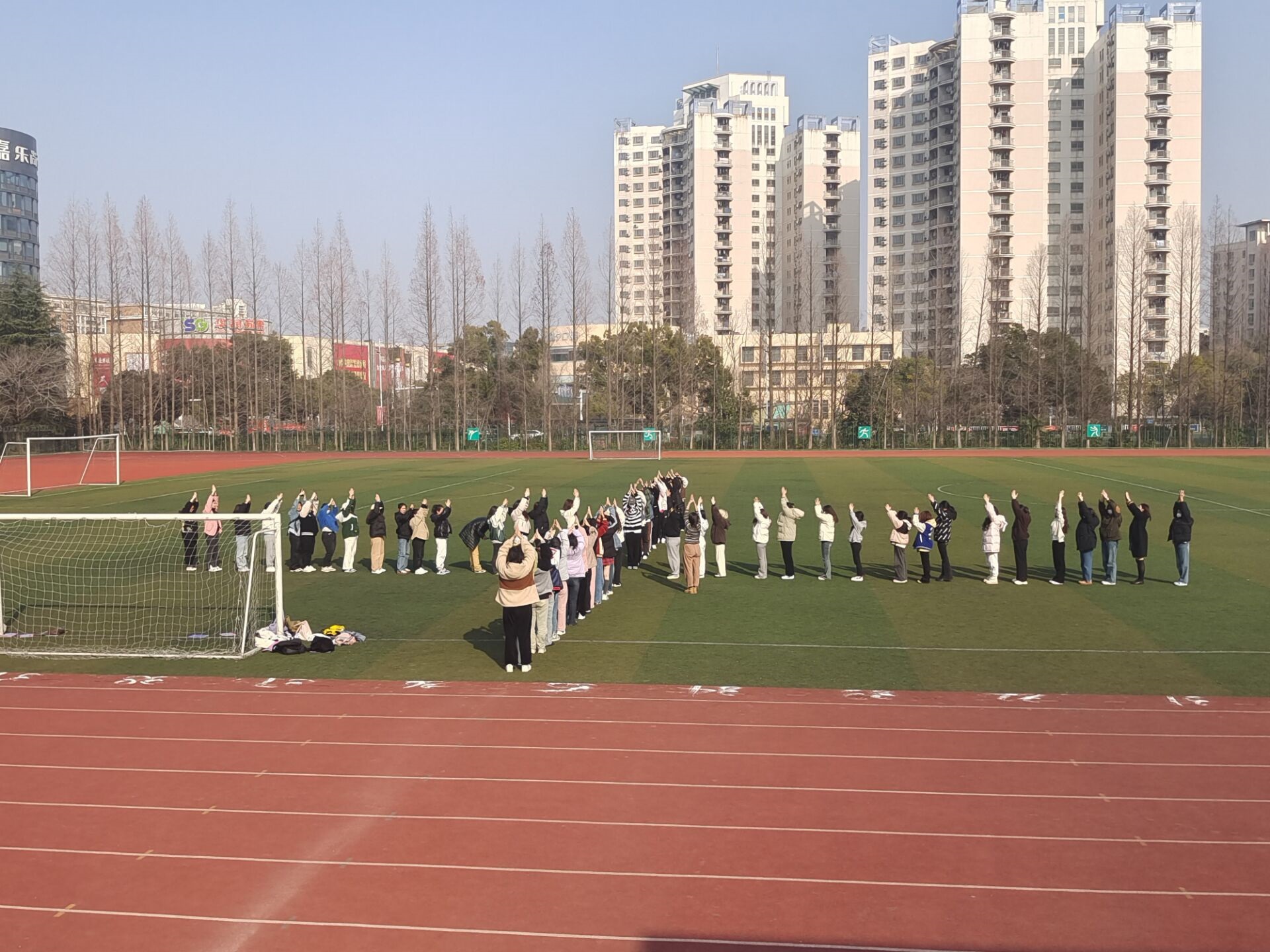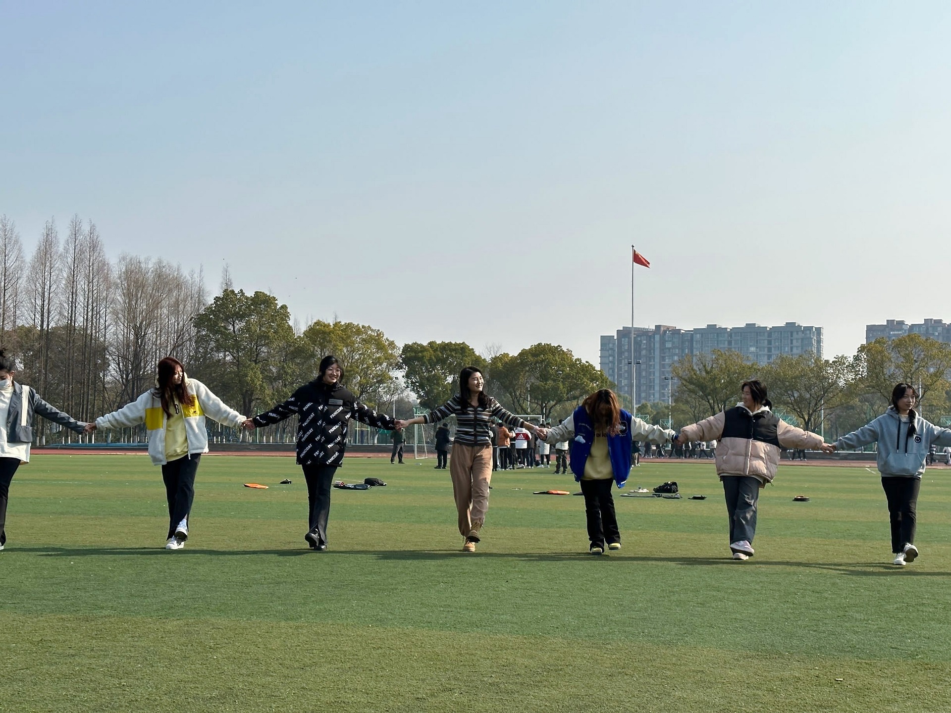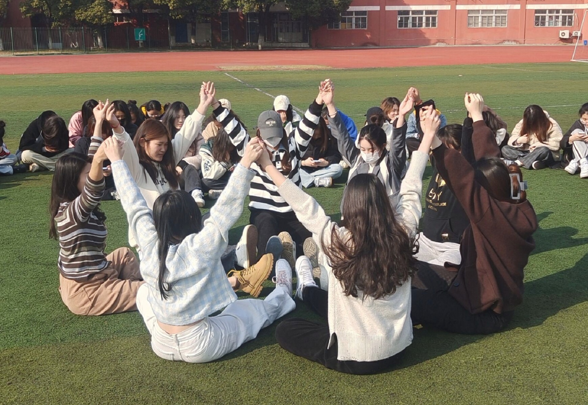全专业76名同学换上彩色的运动服,跟着辅导员一起,走进操场,共同开展瑜伽练习,享受春风的同时,拉伸筋骨。大家或围成圈,或抱成团,或手拉手,或组成小队,动作虽然达不到那么标准,但是每个人脸上都洋溢着笑容,感受着身体舒展,互相配合完成动作的喜悦。整个班级和辅导员融在一起,互助互动,氛围特别好。