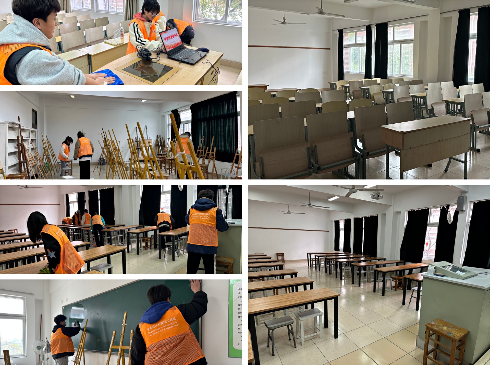 接下来辅导员廖晶晶老师从培养劳动精神出发,阐述了大学生劳动教育的意义,带领同学们进行了劳动教育活动,活动内容为打扫8号楼三层9个教室。活动伊始,班级生活委员为同学们划分小组布置任务,并对清洁程度提出要求。接着,同学们们对黑板槽进行粉笔灰清理,并对讲桌进行物品摆放整理。最后,全体同学以合影留念的方式结束了这次活动。“这次打扫教室不仅让我们体会到雷锋无私奉献的快乐,同时通过这次活动,我们为老师提供了一个干净的讲台,也借此报答师恩。”一位同学如是说。