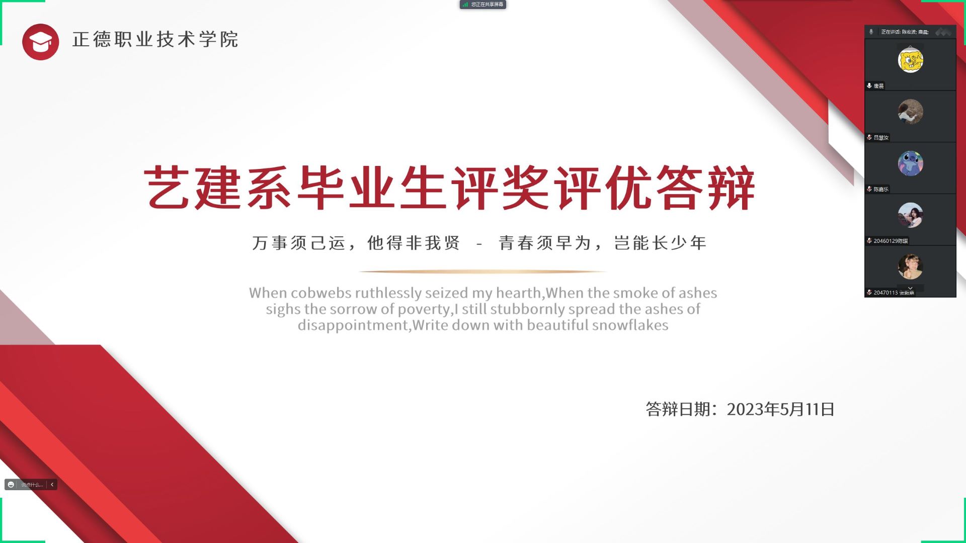 全面贯彻落实立德树人根本任务,充分发挥大学生先进榜样的示范引领作用,评选出一批思想正、品行优、能力强的优秀毕业生,进一步推动学风建设和校园文明建设,艺术设计与建筑工程系根据《av在线 关于做好 2023届毕业生评优工作的通知》,本着公平、公正、公开的原则,于腾讯会议开展了2023届优秀毕业生三好学生、以及优秀学生干部答辩会。