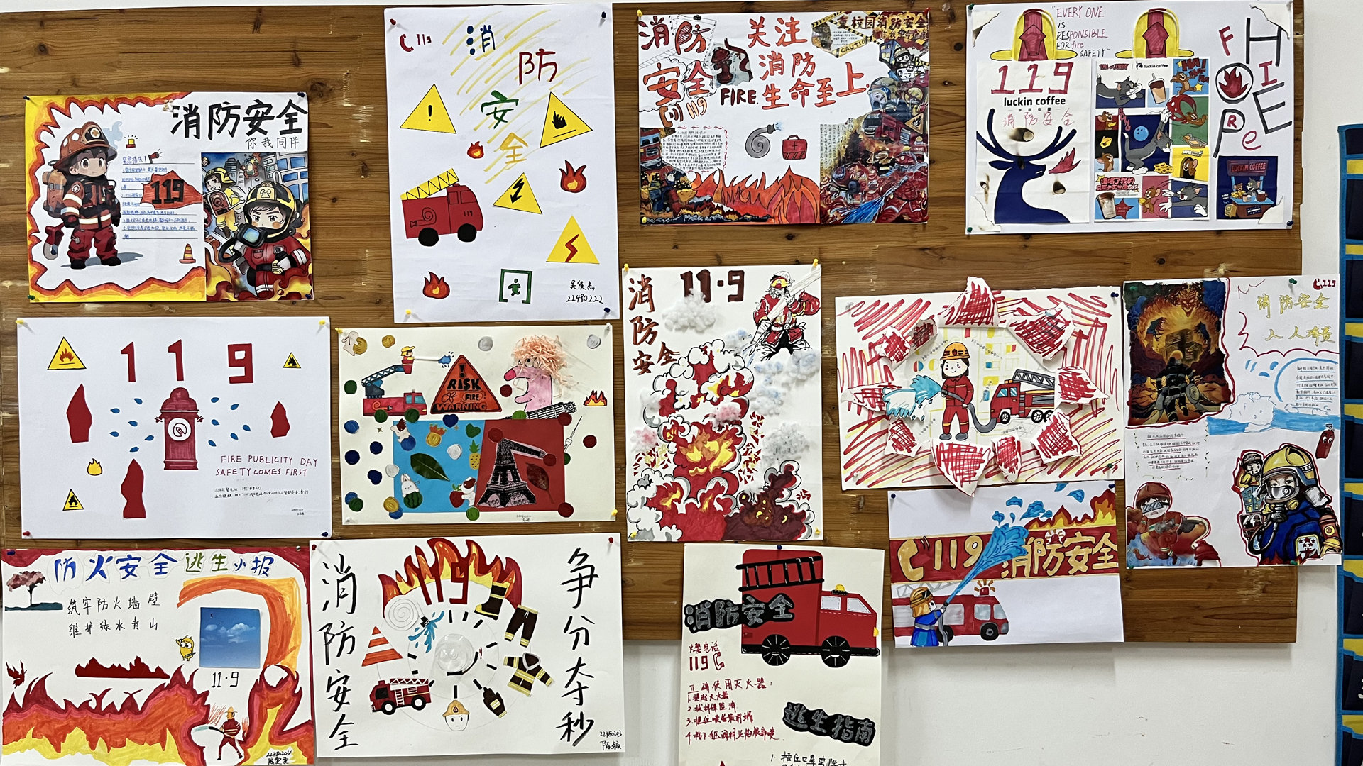 近日,艺建系室内专业构成课中,学生们积极参与“消防实操室室内文化墙装饰及文化区设计大赛”,以独特的手法制作了多幅以消防安全为主题的宣传海报。这些海报不仅传达了深刻的安全意识,也展示了学生们在创意设计和手工制作方面的才能。