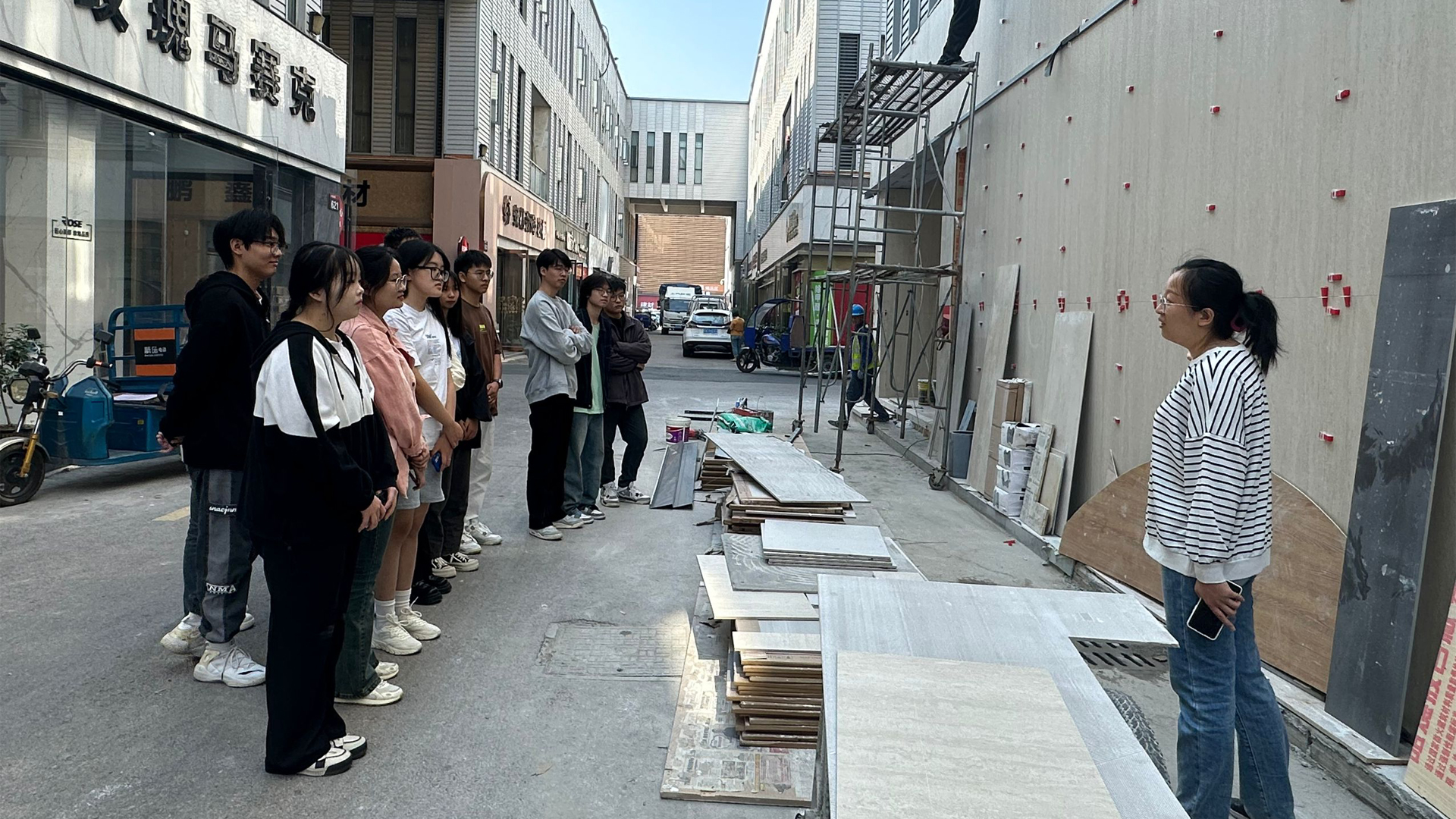 徐雅俊老师还利用装饰城一些正在施工装修门店工程,现场直接展开《装饰材料与施工工艺》的课堂讲解,让学生对材料与施工工艺有一个直观了解。