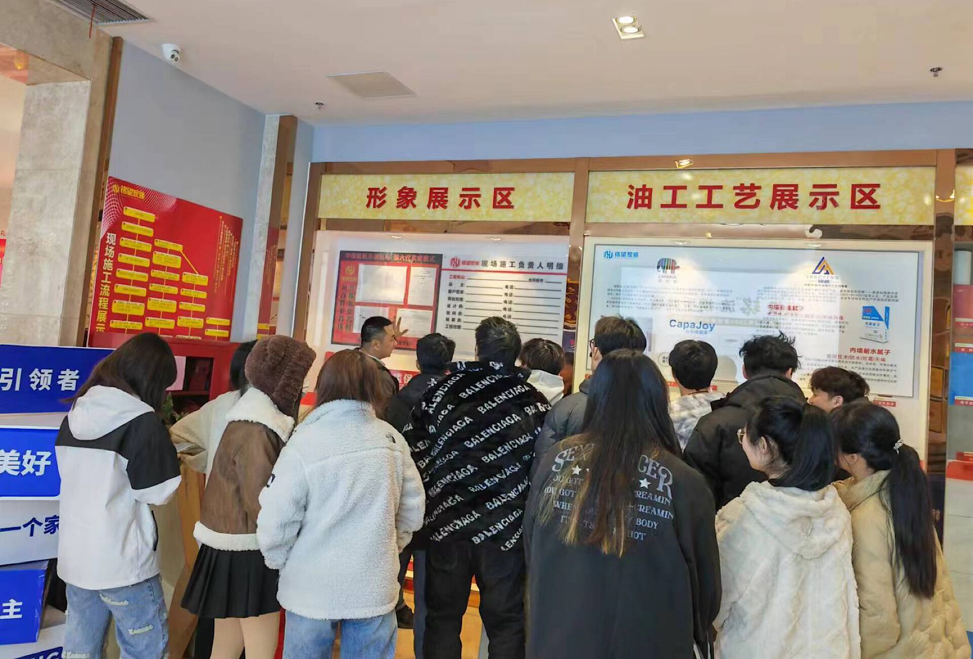 在公司两位资深设计师的带领下,同学们依此参观了施工工艺区、装饰材料展厅、装饰空间样板区、隐蔽工程等。在设计师热情耐心的讲解下,同学们眼见为实,感触良多,尤其是隐蔽工程部分,在工程师的讲解下,大家知道了其重要性,也是后续装饰工程的关键之笔。