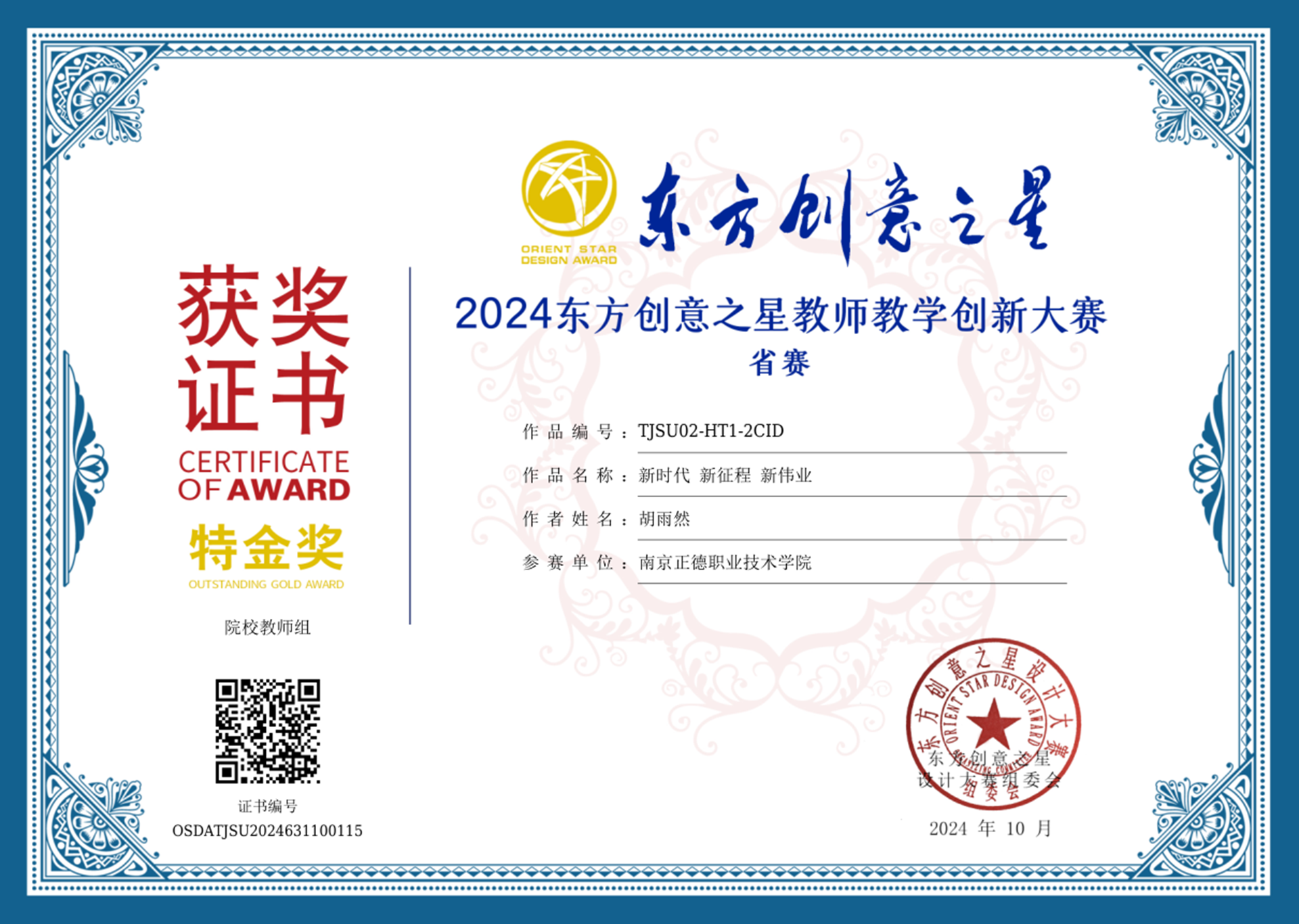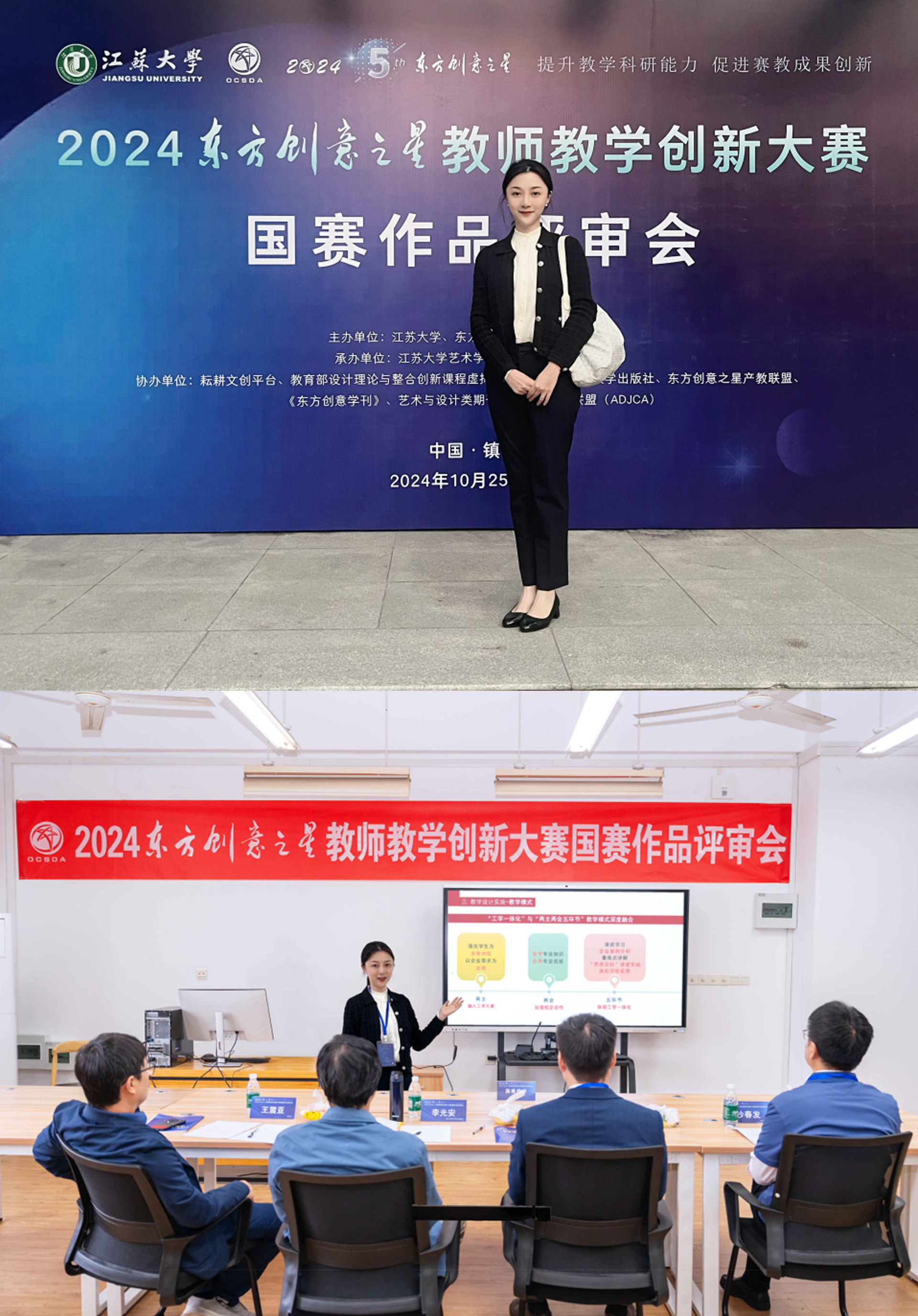 2024年10月25—28日,2024东方创意之星教师教学创新大赛(以下简称教师赛)国赛评审会在江苏大学隆重举行。来自工业和信息化部国际经济技术合作中心、江苏大学、中国美术学院、同济大学、南京工业大学、东南大学、华东师范大学、中国计量大学、山东大学、大连工业大学、上海工程技术大学、《上海视觉》学报等国内著名院校及设计行业的22位领导、知名教授及专家组成国赛评委会,参加了本次国赛终评工作。来自全国25个省区市的96家单位(涵盖天津美术学院和上海大学、东华大学、中南大学等14所“双一流”高校),共计126位代表(23位院长/副院长/教务处长,1位博士生导师、2位博士后、36位博士,45位教授/副教授等高层次参赛作者)参加了线下答辩。av在线 艺术设计与建筑工程系的王陶老师,在现场授课答辩环节中,全面展现了其卓越的教学技能与创新性成果。经由评审专家团的严格评审,荣获东方创意之星教师教学创新大赛国赛金奖。