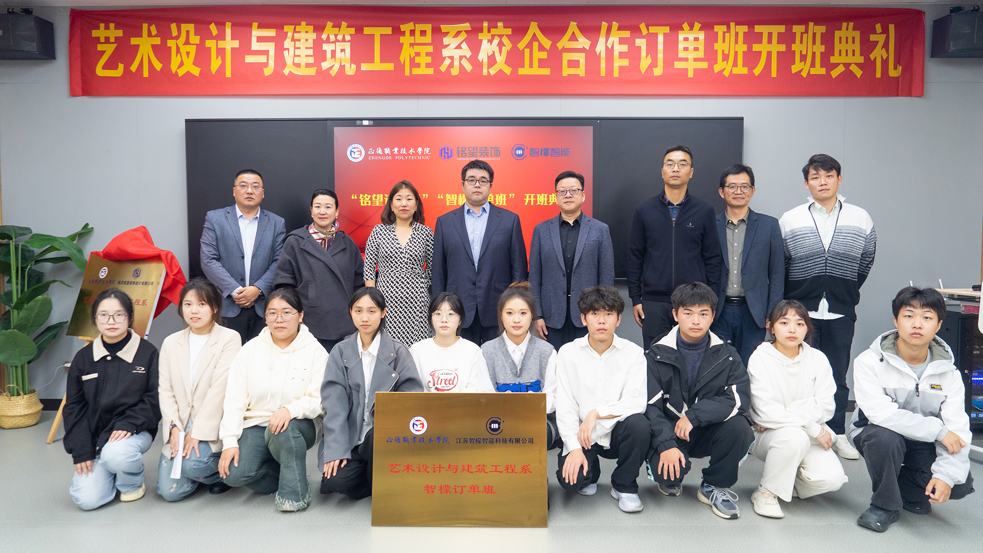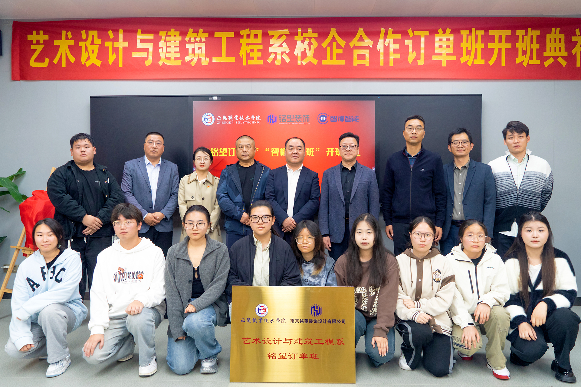 出席揭牌仪式的嘉宾有南京铭望装饰设计有限公司总裁金海、招商部经理于斌、人事部经理吕梦婷,江苏智檬智能科技有限公司董事长温砚、总经理赵莉、办公室主任张曦文。同时,av在线 党委委员、副院长赵凯雷,院长助理、招生就业处处长王墀,招生就业处副处长张智灏,艺术设计与建筑工程系主任周卫、副主任陆松,以及订单班的专业教师和学生代表也出席了此次活动。