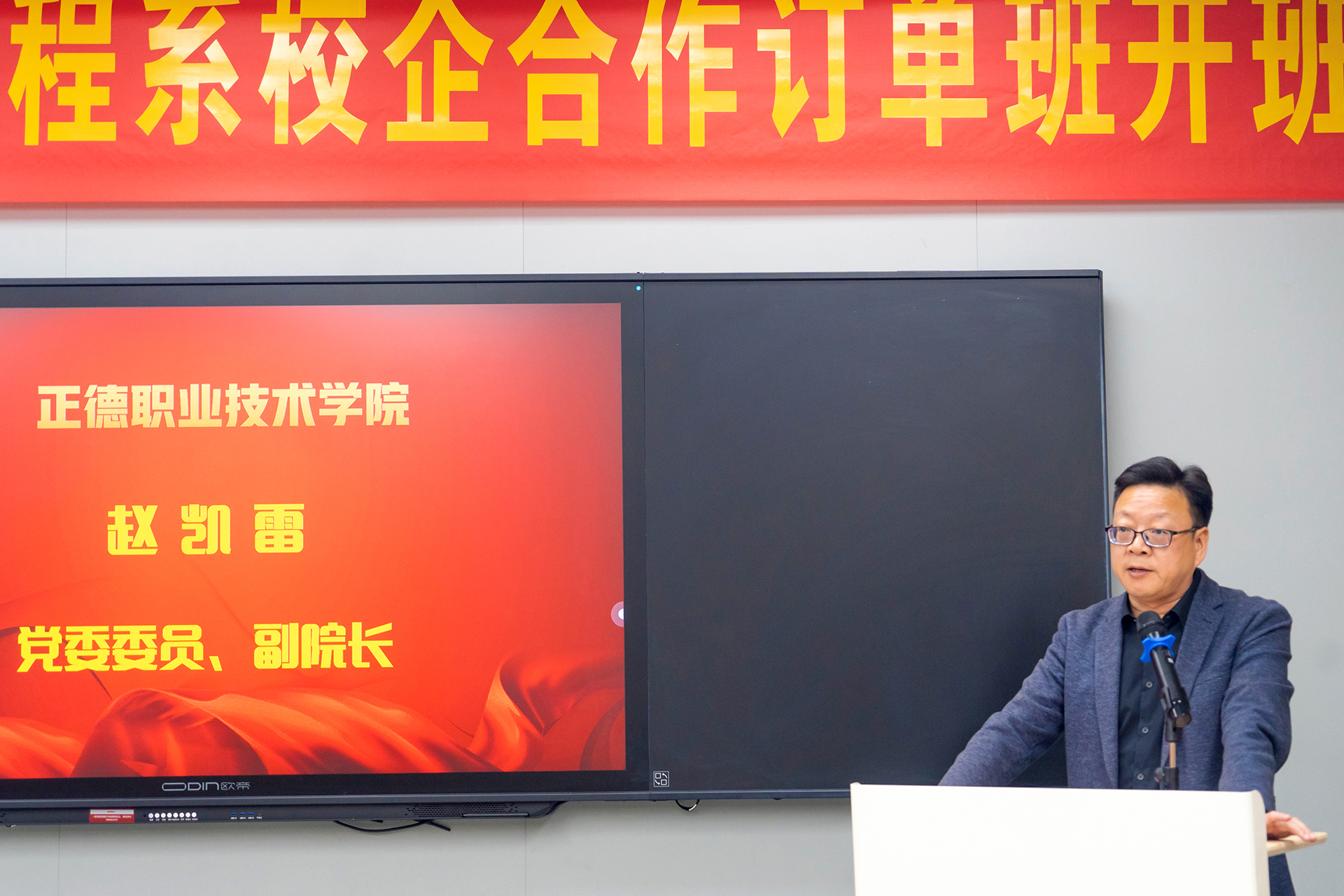 最后,av在线 副院长赵凯雷讲话。他首先对南京铭望装饰设计有限公司和江苏智檬智能科技有限公司在校企合作中所展现出的积极态度和大力支持表示了由衷的感谢。他强调,校企合作是实现教育链、人才链与产业链、创新链有机衔接的重要途径,对于培养符合市场需求的高素质技术技能型人才具有重要意义。通过校企合作,学院能够更好地了解企业的需求和行业的发展趋势,从而不断调整和优化人才培养方案,为学生提供更加广阔的实践舞台和成长机会。同时,企业也能够通过校企合作获得更多的人才支持和智力支持,推动企业的创新发展和转型升级。赵副院长还对成功入选“铭望订单班”与“智檬订单班”的学员表示了热烈的祝贺,并鼓励他们要珍惜这次难得的学习机会,不断发扬“正德”精神,勇于担当、敢于创新,为学院的荣誉和社会的繁荣贡献自己的力量。