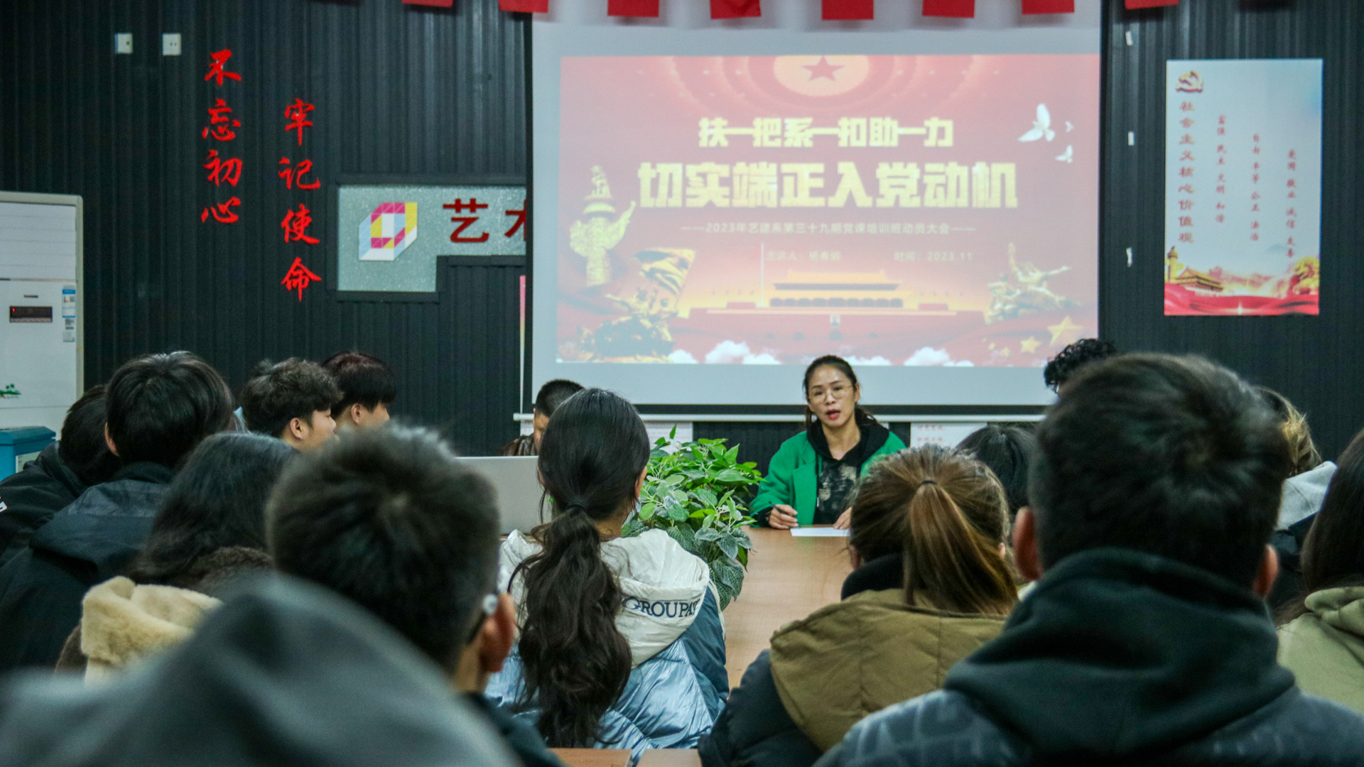为教育和引导入党积极分子学习贯彻党的二十大精神,深入学习领会习近平新时代中国特色社会主义思想的精神实质和丰富内涵,不断加强党性修养,牢固树立正确的世界观、人生观、价值观。2023年11月15日晚上6点半,艺术设计与建筑工程系党支部在8204教室召开了第39期党课培训动员大会。艺建系党支部书记杨春娟出席会议,第39期党课全体学员参会。会议由系组织委员闵济舜老师主持。