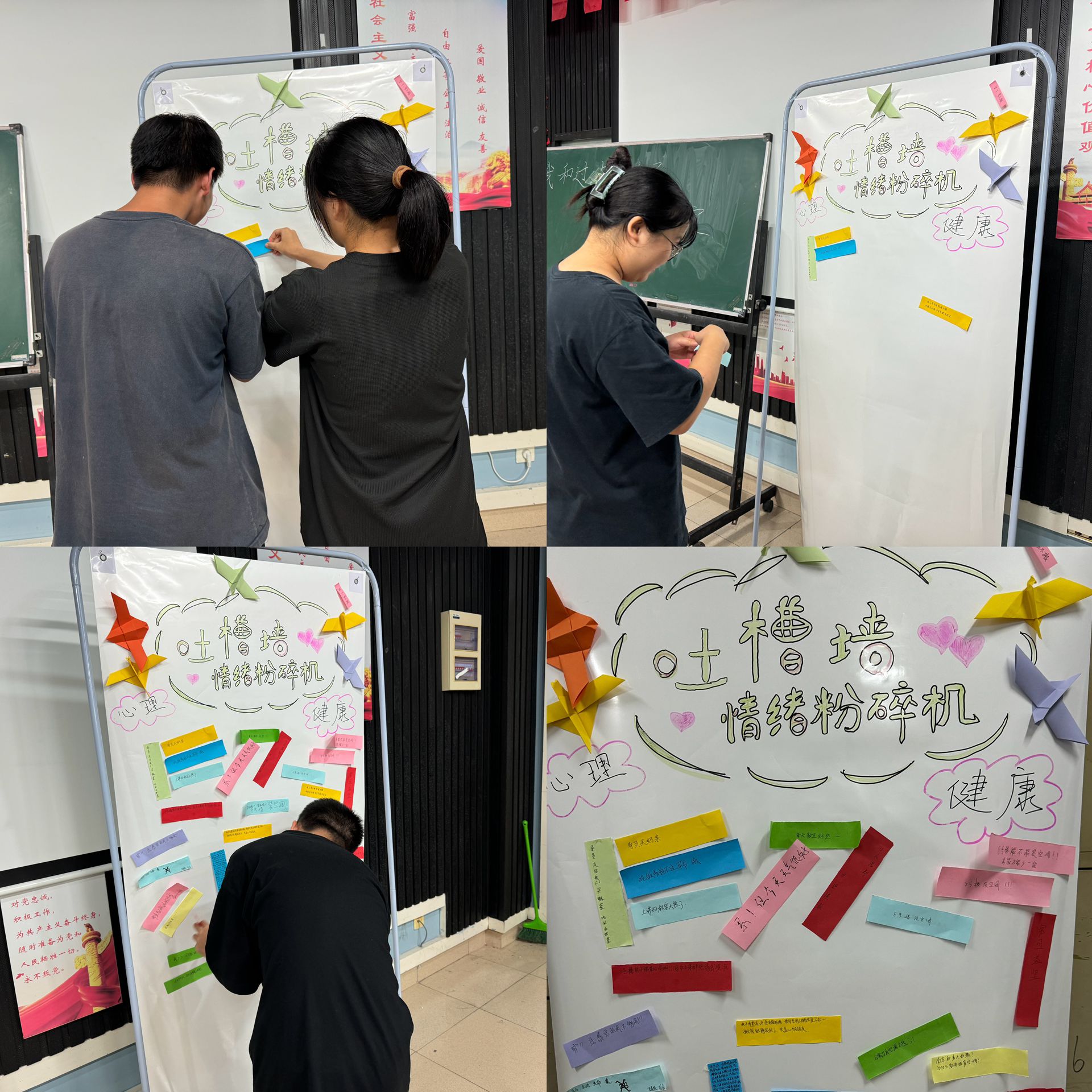 活动现场设置精心设计了“吐槽墙·情绪粉碎机”“我和过去的自己有个约定”两大环节,旨在为学生提供多样化的情绪释放渠道。在“情绪粉碎机”区域,学生们被鼓励写下自己近期的烦恼、焦虑等负面情绪,通过文字的形式将内心的重压倾诉出来。这一过程不仅让学生们感受到倾诉的轻松,还增强了他们面对困难时的勇气和决心。