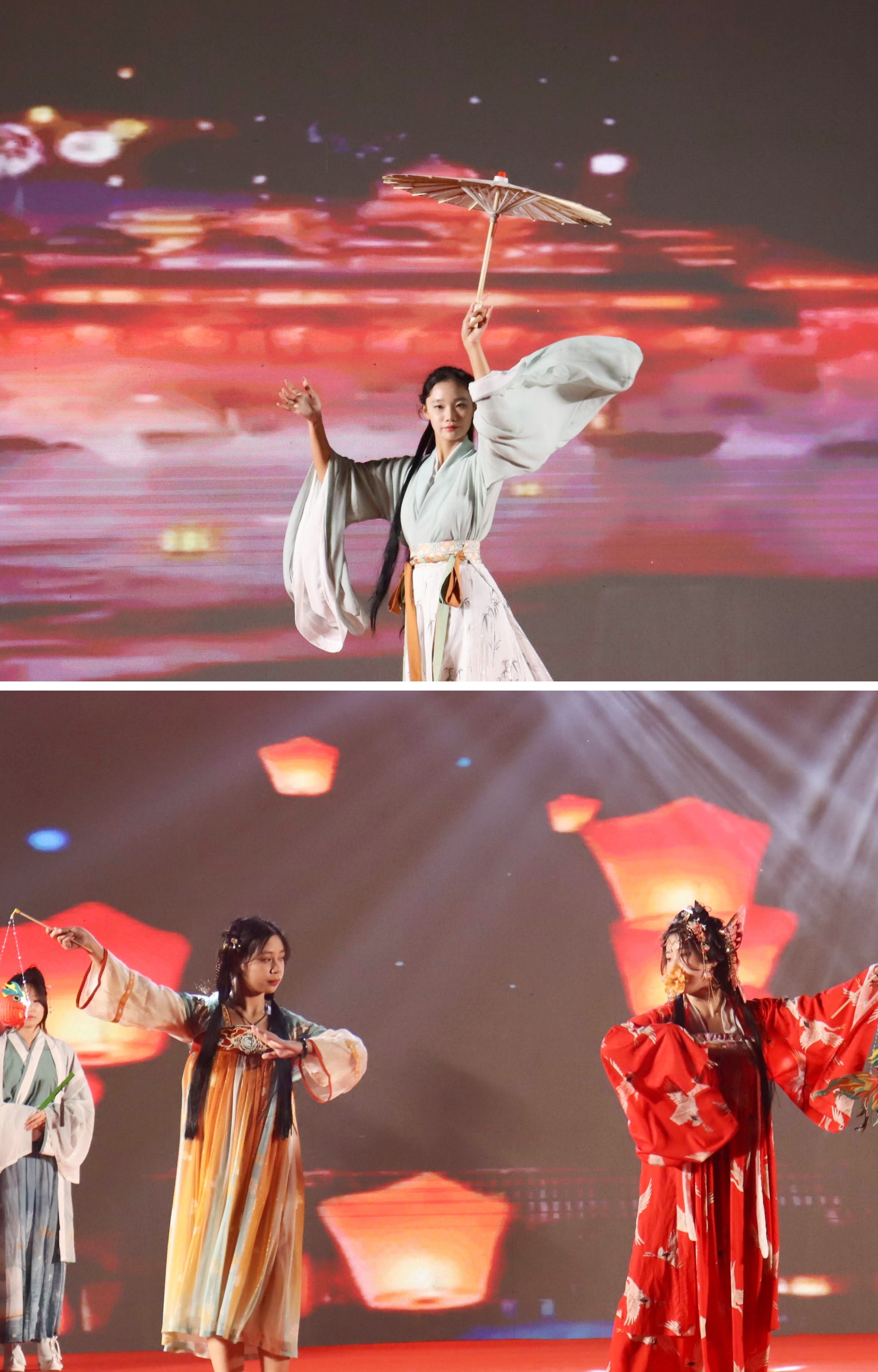 晚会第二篇章充满了青春梦想的活力和逐梦奋进的斗志。戏曲表演《牡丹亭》百转千回,声声天籁,展示了中华优秀传统文化,让观众们感受到昆曲艺术的魅力。歌曲《快乐女孩》,引领大家跟随音乐的律动,忘却忧愁,活力四射跳出属于自己的快乐旋律。吉他弹唱《晴天》,向大家诠释了什么是一样的青春,不一样的精彩,鼓励大家保持最好的状态,在青春的赛道上奋力奔跑。情景剧《逃出大英博物馆》,用浪漫的幕后故事 ,独特的立意、精细的设计,一句“请带我回家”的承诺让“文物奔赴”,提醒广大青年勿忘国耻,吾辈当自强。汉服社带来的舞蹈《花月宴》,让大家体验到身临其境般的穿梭时空,绽放华美之姿。热情似火的拉丁《恰恰》,让欢快地气息弥漫全场。
