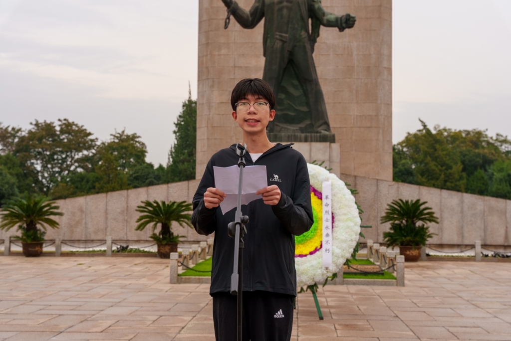 下午2点,青马班学员来到雨花台烈士纪念碑下进行缅怀仪式。首先集体默哀一分钟,表达对革命先烈的崇高敬意和深切追掉。接着,十三期青马班学员代表魏宇进行主题演讲,他说新时代的青年要感知如今和平生活的不易与珍贵,要学习英烈崇高的爱国主义精神和顽强不息的拼搏精神,要牢记青春使命、传承红色基因,在新时代新征程中努力奋斗,为全面建设社会主义现代化国家、全面推进中华民族伟大复兴贡献青春力量。随后,全体学员重温入团誓词,铿锵有力的入团誓词在烈士陵园上空久久回荡。