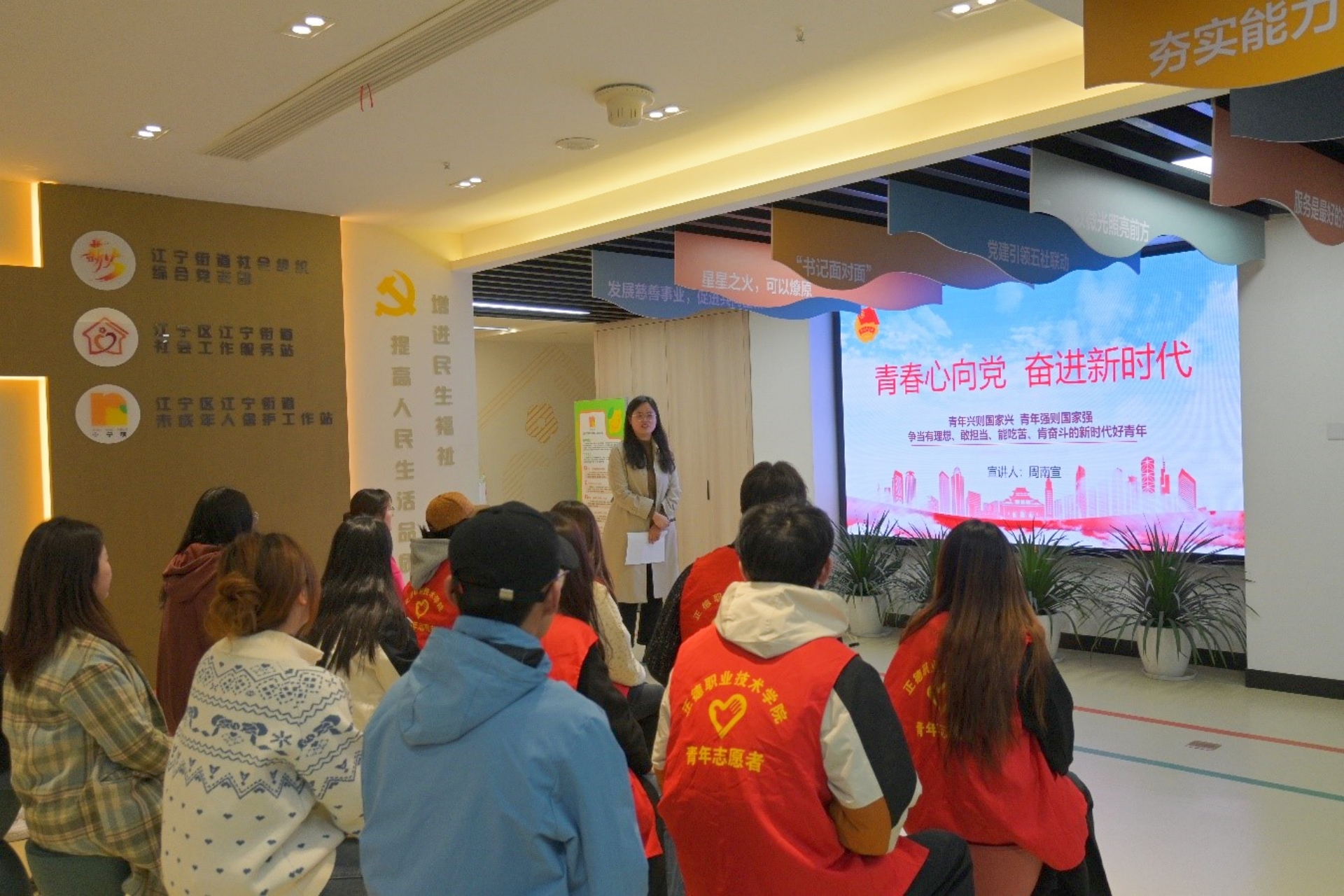 听一堂青春宣讲。参观完毕后,便民中心党支部的青年党员们为志愿者们呈现了一场深入人心的宣讲。他们以“青春心向党 奋进新时代”为主题,用生动的语言、鲜活的事例,讲述了党的光辉历程和伟大成就。宣讲中,党员们深情地分享了他们在党的引领下,如何践行青春理想、勇担时代使命的故事,激励着每一位在场的志愿者。志愿者们听得聚精会神,深受启发。他们纷纷表示,要将这次宣讲的精神内化于心、外化于行,以更加饱满的热情投身到志愿服务中去,用实际行动践行青春誓言,为新时代的发展贡献自己的力量。