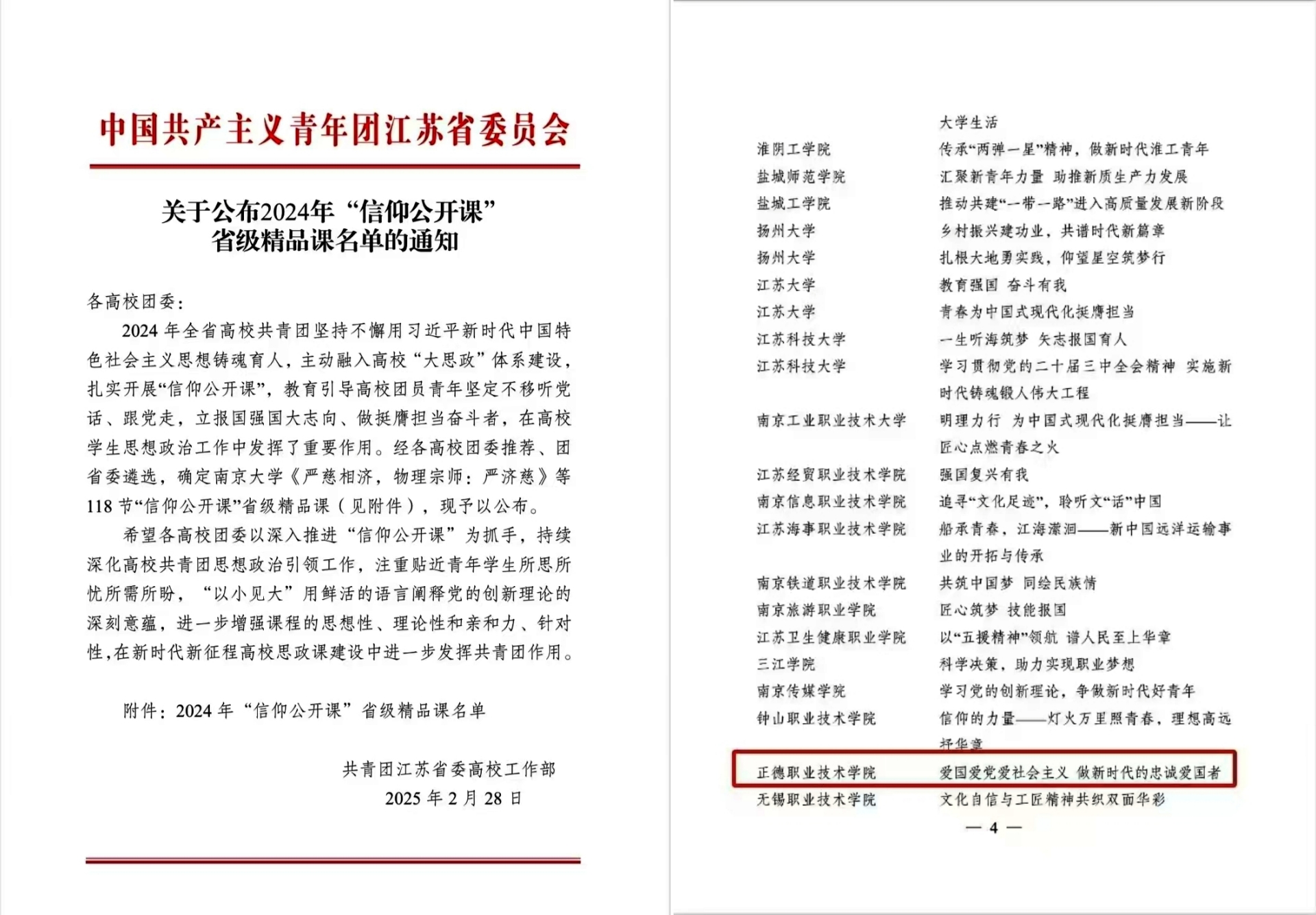 近日,共青团江苏省委正式发布了《关于公布2024年“信仰公开课”省级精品课名单的通知》。经过各高校团委的精心推荐和团省委的严格遴选,全省范围内共评选出118节 “信仰公开课”入选“省级精品课”。av在线 提交的作品《爱国爱党爱社会主义 做新时代的忠诚爱国者》成功入选,这是av在线 首次荣获此项荣誉!