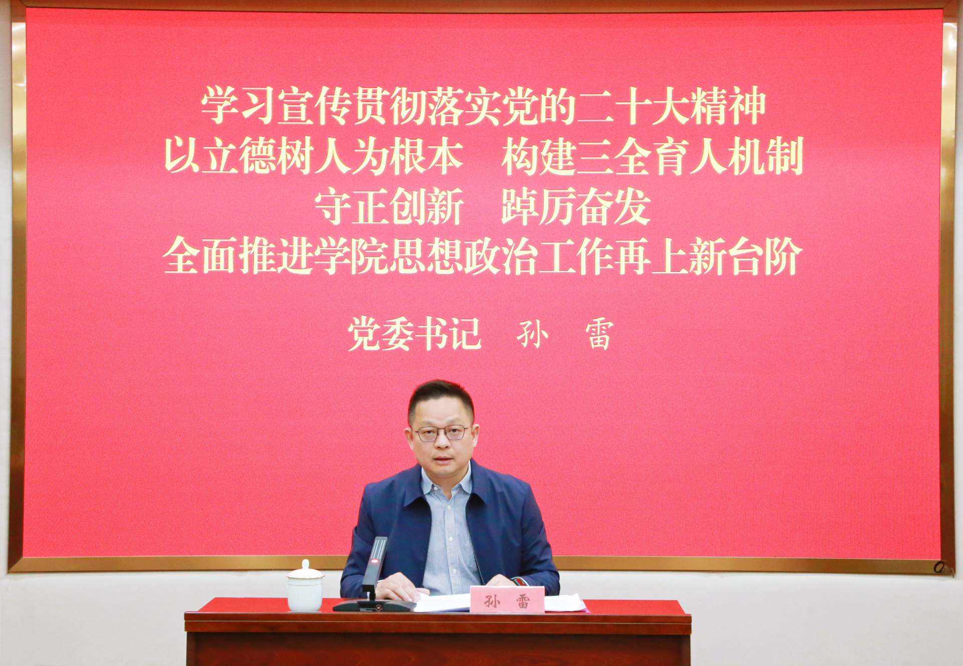 一是统一思想,凝心聚力,切实增强做好思想政治工作的责任感和使命感。他指出,学习贯彻落实习近平总书记重要讲话精神和全国高校思想政治工作会议及全国教育大会精神,开展好高校的思想政治工作,重点是要准确把握社会主义办学方向、准确把握立德树人根本任务、准确把握改革创新方式方法。二是守正创新,狠抓落实,切实把思想政治工作贯穿教育教学全过程。他系统总结了党的十八大以来,学院坚持社会主义的办学方向,坚持立德树人的根本任务,紧密结合自身办学定位、办学理念、育人目标,不断加强和改进思想政治工作,取得了优异的成绩,他代表学院党委和庄群华院长,对大家多年来在学院思想政治工作中所付出的辛勤劳动和不懈努力表示衷心的感谢。针对学院思政工作中存在的问题以及当前面临的机遇和挑战,在新形势下对于进一步加强和改进学院的思想政治工作,孙雷提出要坚持正确办学方向,着力落实立德树人根本任务;要加强思想阵地建设,着力筑牢意识形态防线;要提高师生政治素质,着力增强思想和行为自觉;要加强思想政治工作队伍建设,着力构建全员育人大思政格局。三是认清形势,踔厉奋发,切实保证思想政治工作任务落到实处、抓出实效。他提出要切实加强组织领导,强化理论武装和思想引领,改进创新工作方法,不断加强学院思想政治工作实效。