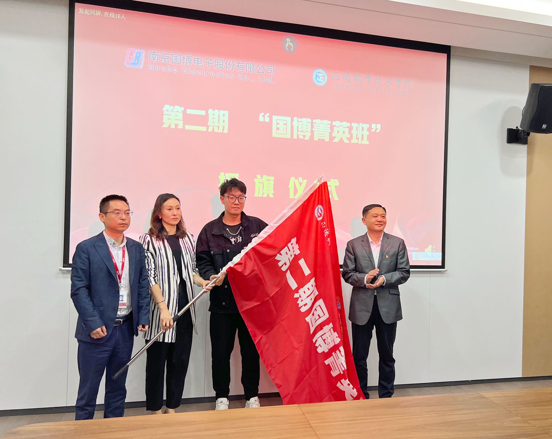 江爱华、周骏为第二期“国博菁英班”授旗,班主任吴慧、班长虞康平接旗。