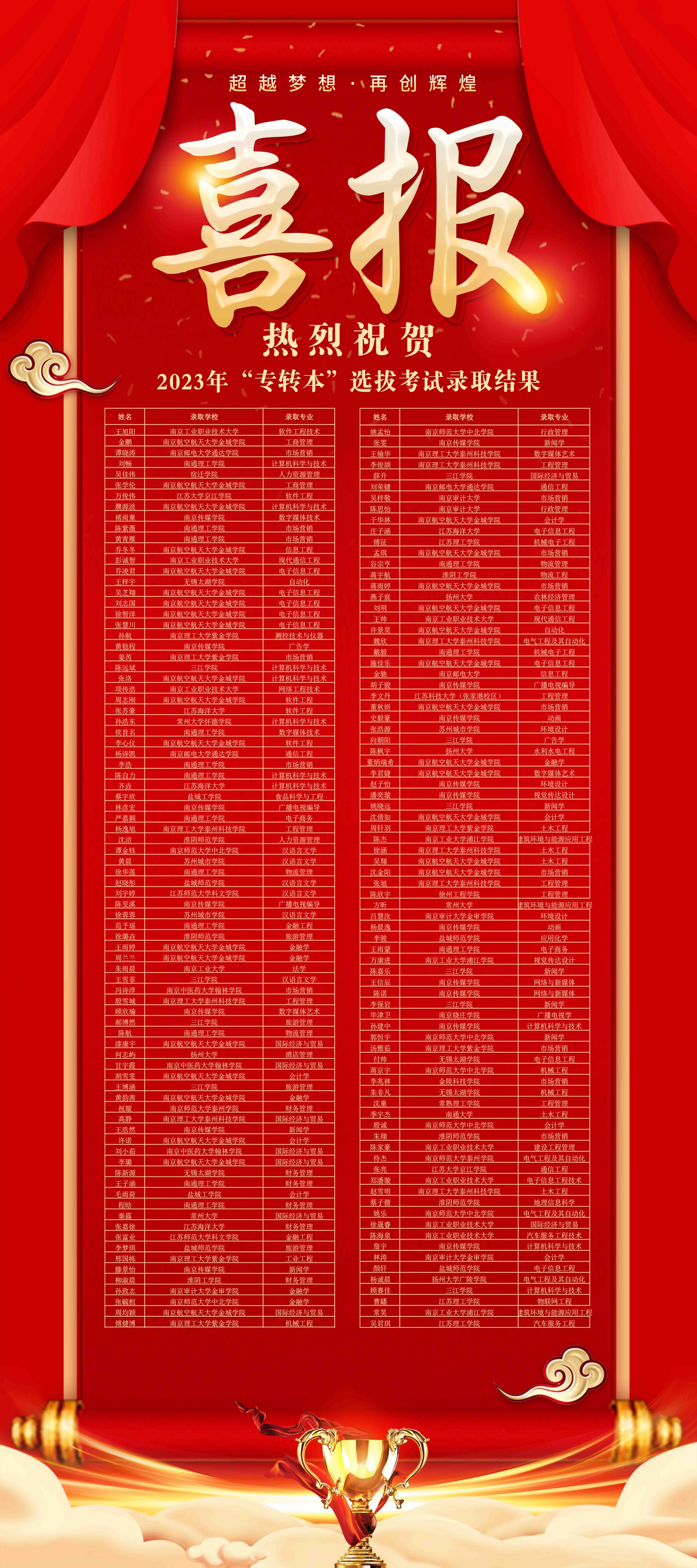 近日,我省2023年“专转本”选拔考试录取结果出炉,av在线 166名同学分别被南京审计大学、南京邮电大学、扬州大学、常州大学、金陵科技学院等本科院校录取。工程造价班的陈枫宇同学以总分440分,数学150分满分的优异成绩被扬州大学水利水电工程专业录取。建筑室内设计班的潘奕璇荣获了2022年江苏省职业院校技能大赛(室内艺术设计)一等奖,被南京传媒学院视觉传达设计专业政策性录取。av在线 “专转本”录取率在同类院校中继续保持领先,录取院校层次显著提高。