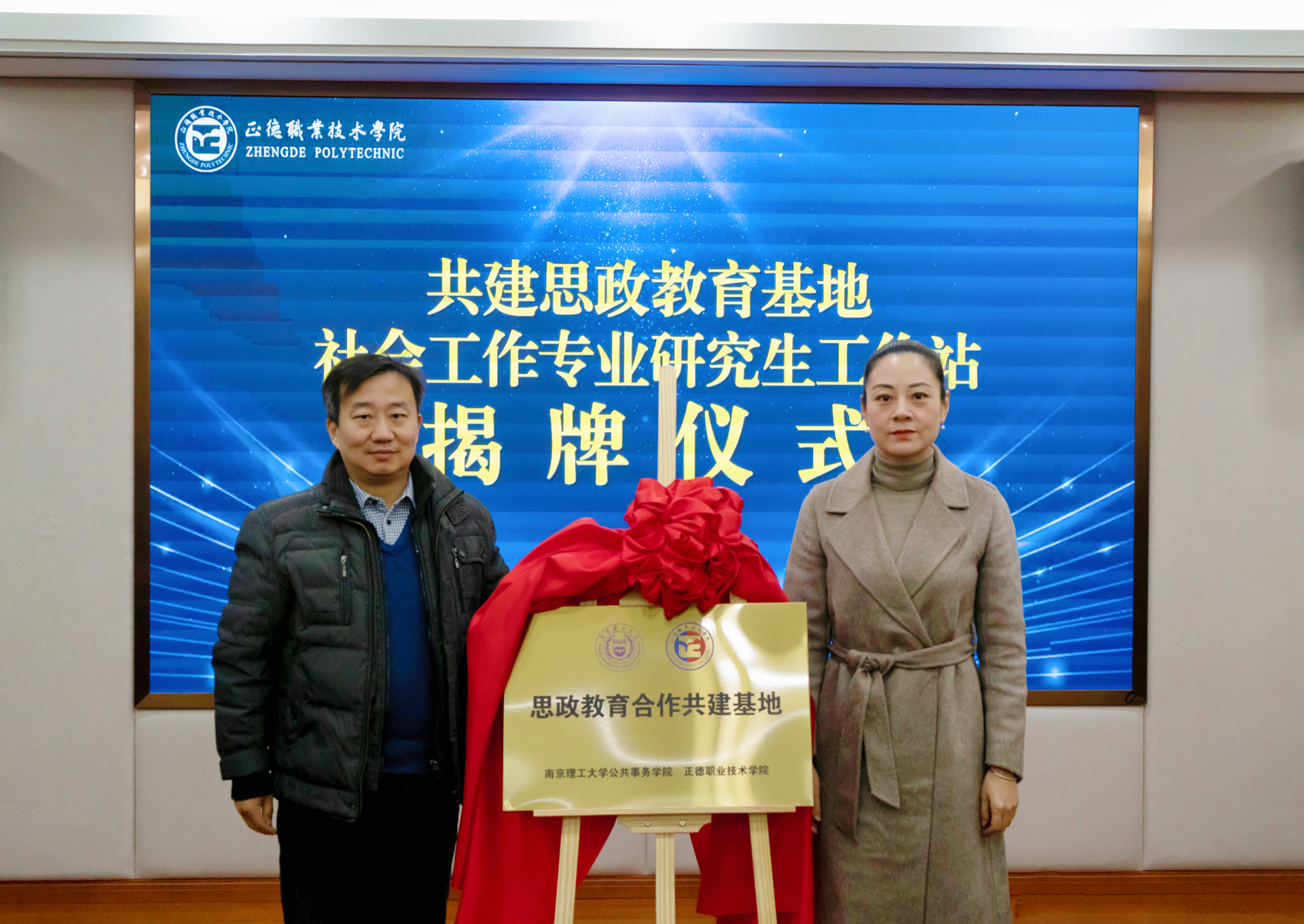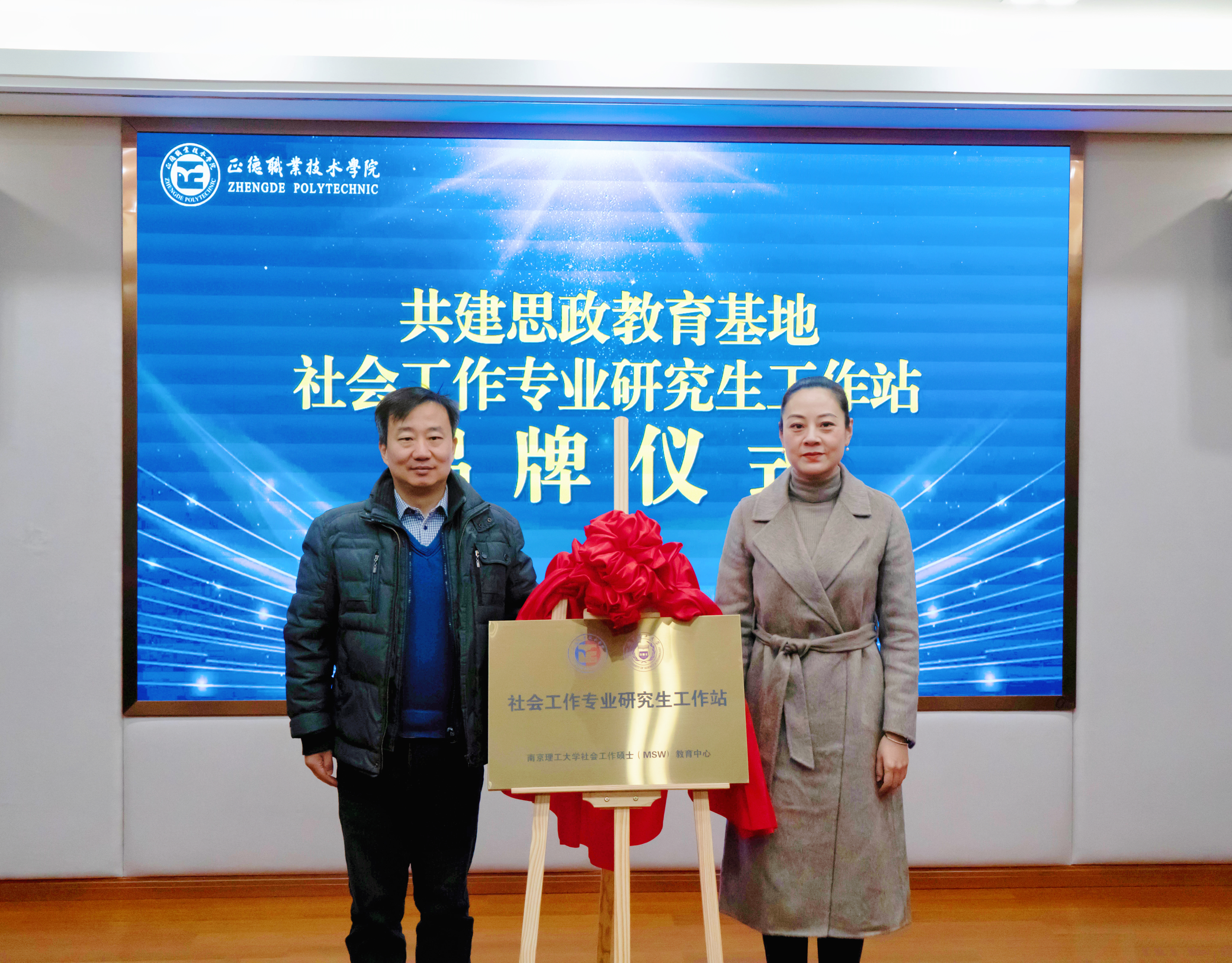 赵奇栋和梁薇共同为思政教育合作共建基地、社会工作专业研究生工作站揭牌。