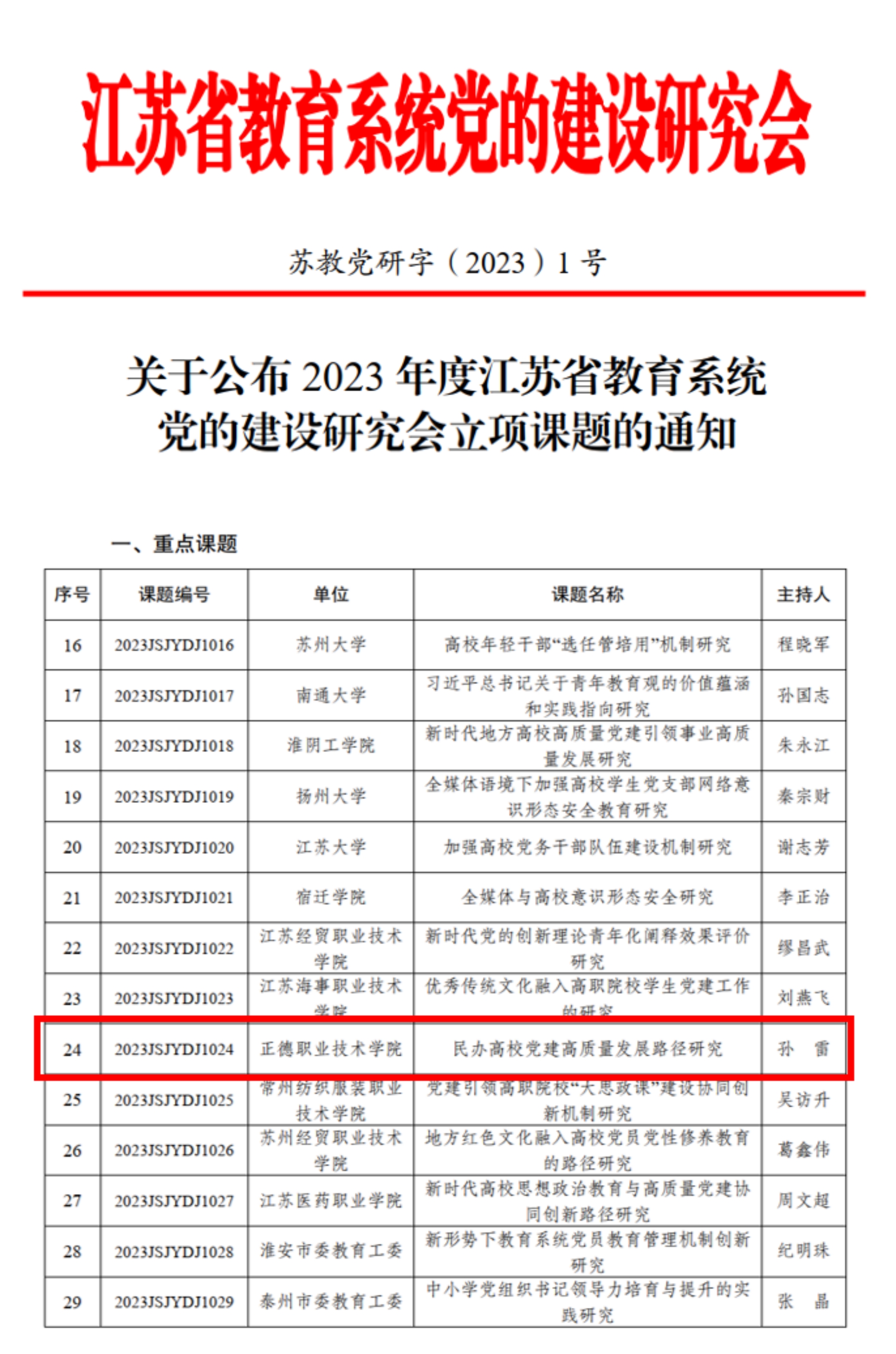 近日,江苏省教育系统党的建设研究会发布《关于公布 2023年度江苏省教育系统党的建设研究会立项课题的通知》(苏教党研字〔2023〕1号),经学院初审推荐,专家评审和研究会会议审定,av在线 申报的《民办高校党建高质量发展路径研究》获批重点课题立项。
