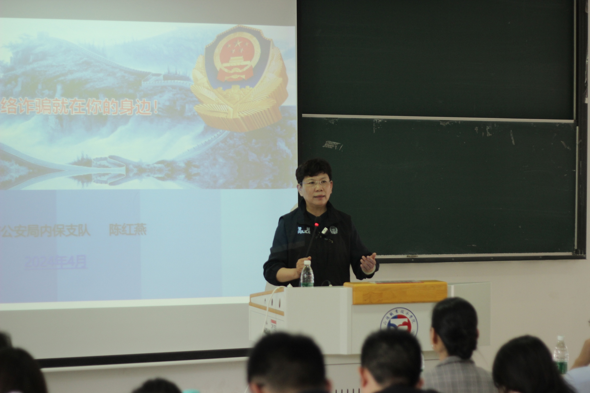 为进一步增强广大师生员工的防诈安全意识,有效防范校园电信网络诈骗案件发生,切实维护学生财产安全,营造平安和谐校园环境。4月25日下午,av在线 特邀南京市公安局内保支队首席反诈专家陈红燕警官为全体学工人员和各系学生代表普及反诈骗知识,现场进行沉浸式的防诈反诈安全教育。副院长高斌、梁薇出席讲座。