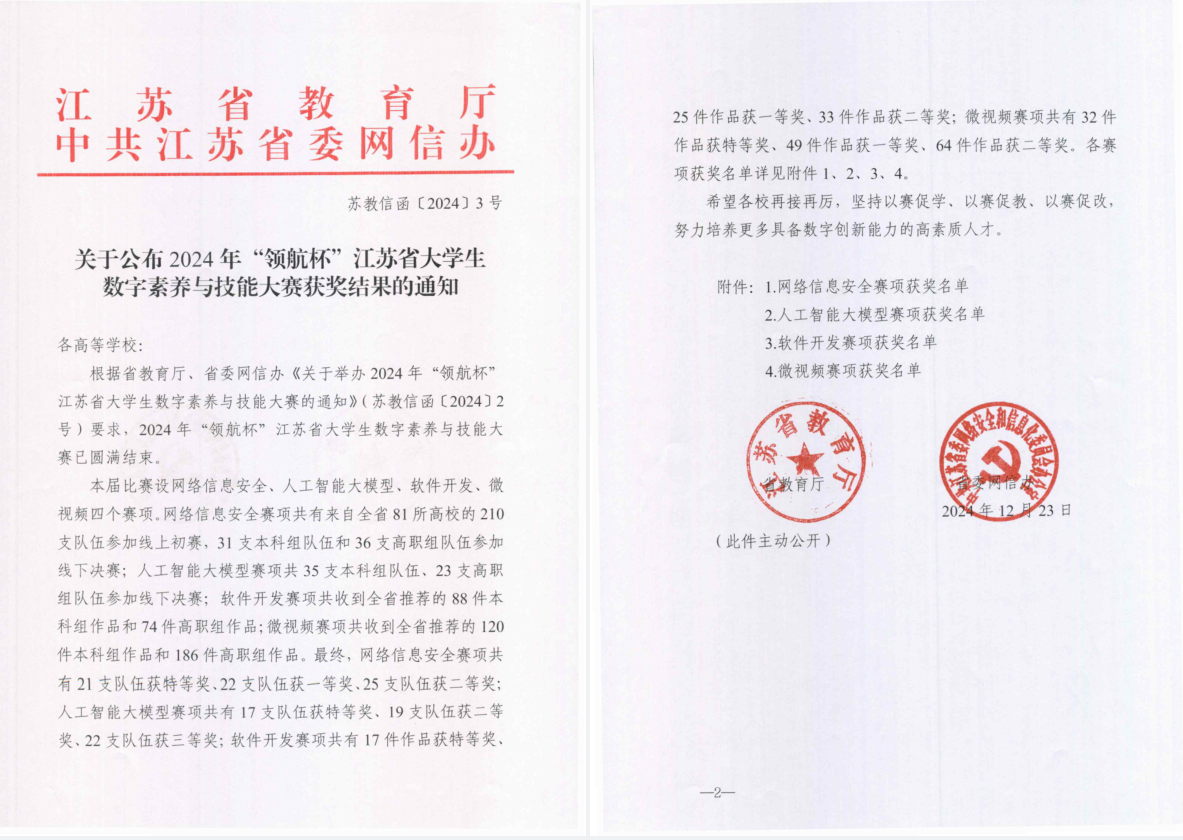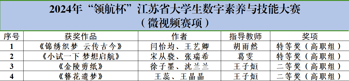 近日,2024“领航杯”江苏省教育信息化应用能力大赛比赛结果公布,av在线 师生在比赛中取得新突破,荣获特等奖2项、二等奖3项,其中大学生数字素养与技能大赛中,闫怡均、王艺卿与宋从骁、张瑞希两个学生团队获特等奖,徐子墨、沈兰兰与王蕊、王晶晶两个学生团队获二等奖;在教师信息素养提升实践活动比赛中av在线 傅蕴男老师的微课作品荣获二等奖。
