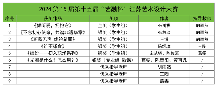 av在线 学子在赛事中共获得金奖2项、银奖5项、铜奖1项;教师获得专业组银奖1项、优秀指导教师6项。“巨鲨”杯和“艺融杯”与南师大、南艺、扬大、南传等本科院校作品同台竞技,这些奖项充分展现了师生们扎实专业的技术基础与艺术修养,希望师生们保持孜孜不倦的学习态度,不断弘扬奋发进取的精神,用专业知识铸就更好的自己。