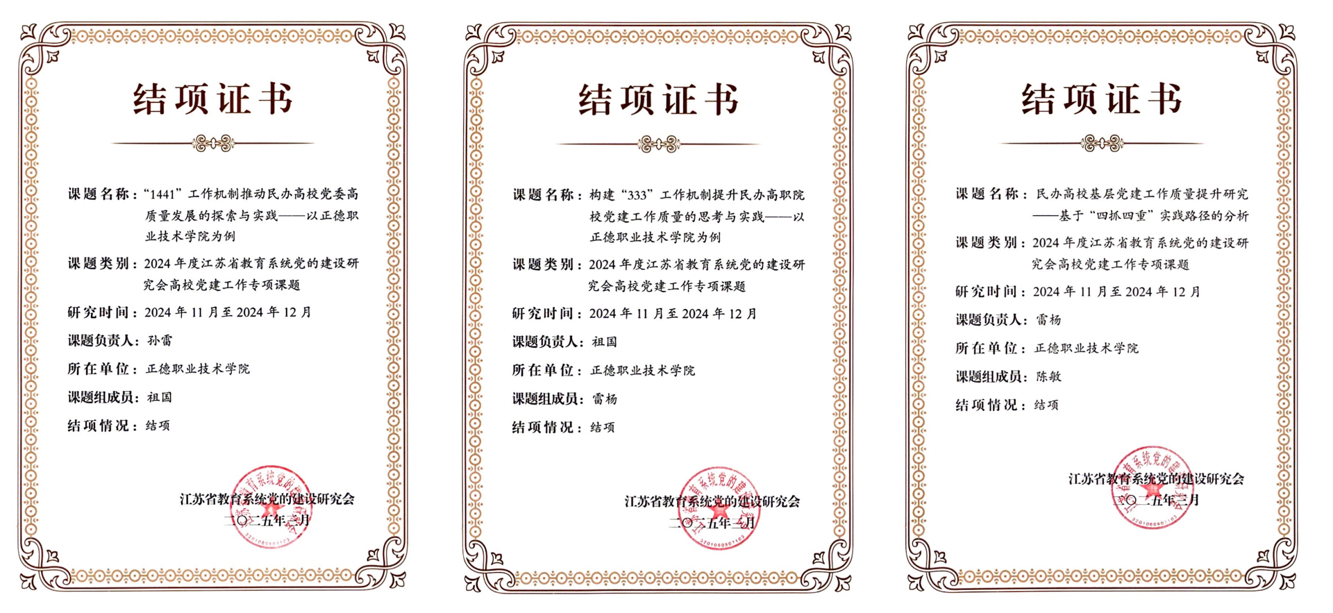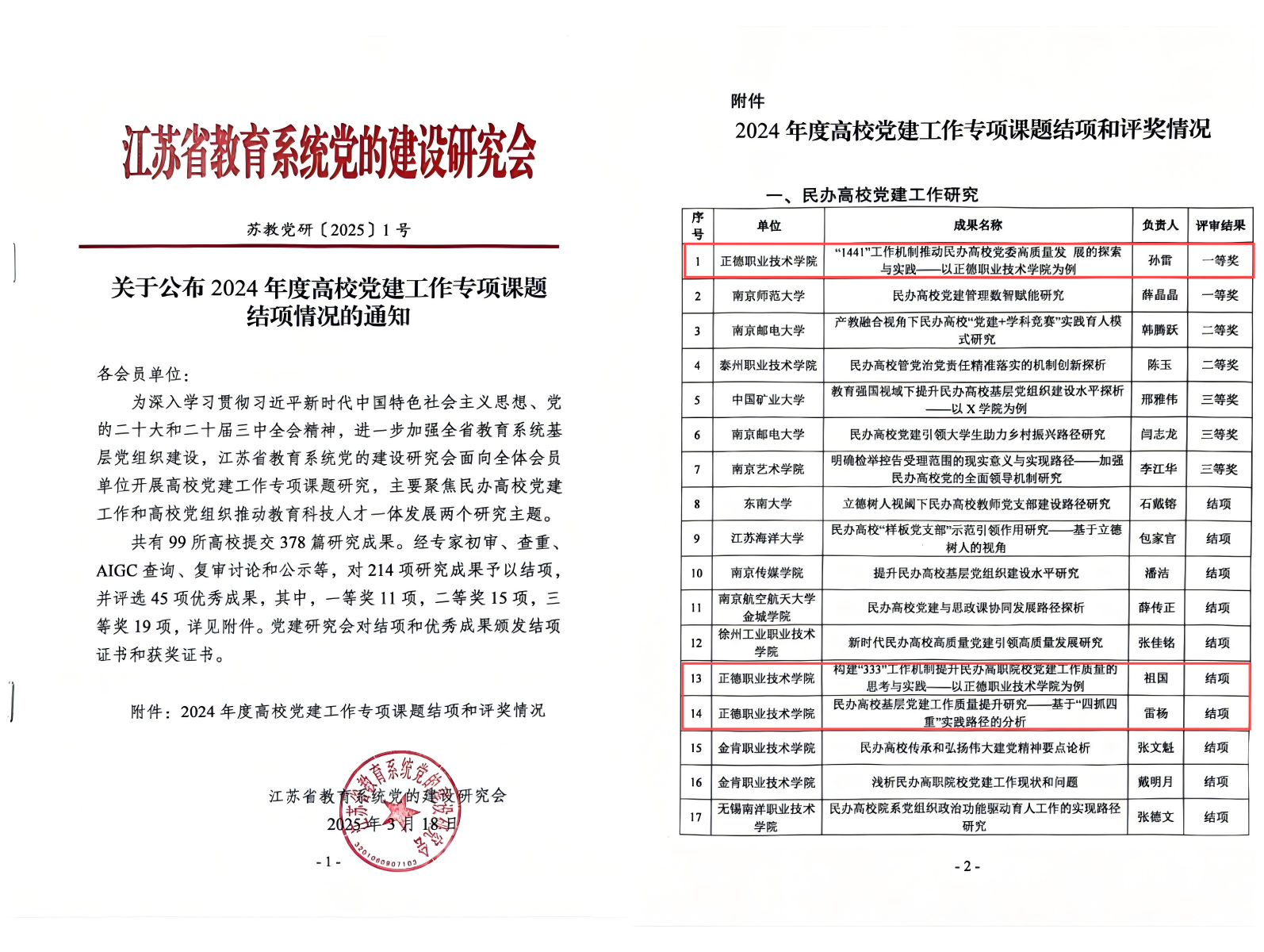 2024年11月,江苏省教育系统党的建设研究会聚焦民办高校党建工作和高校党组织推动教育科技人才一体发展两个研究主题,面向全省高校进行了成果征集。共收到99所高校提交的378篇研究成果,经过评审,最终批准214项研究成果予以结项。另外,在批准结项的成果中,共评选出45项优秀成果,其中一等奖11项、二等奖15项、三等奖19项。av在线 课题从全省高校提交的参评项目中脱颖而出,喜获一等奖,是av在线 在党建理论研究与实践创新领域取得的又一重要突破,充分体现出党建工作理论思考与实践操作的有效融合。