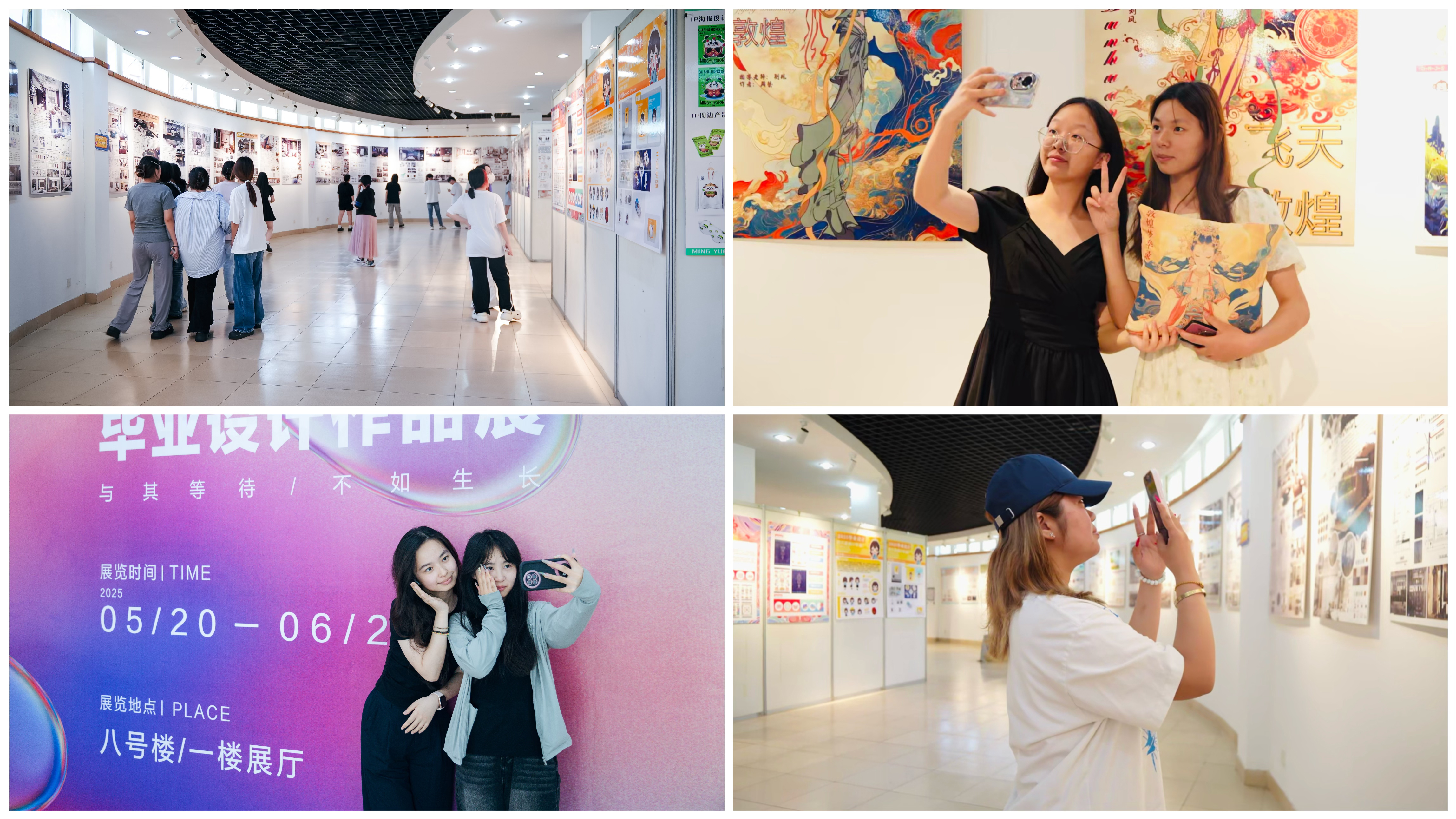 本次展览以“与其等待,不如生长”为核心理念,通过城市更新、适老宜居、乡村文化振兴、传统文化传承、非遗海报设计、文创与数字产品开发、企业IP形象设计及宣传片制作等多元题材,展现学生立足行业实践、探索技术与艺术融合的深度思考。展厅内,主题鲜明的海报与创意十足的作品吸引众多师生、企业代表驻足观摩,每件作品均体现了学生扎实的专业功底与创新突破的实践精神。