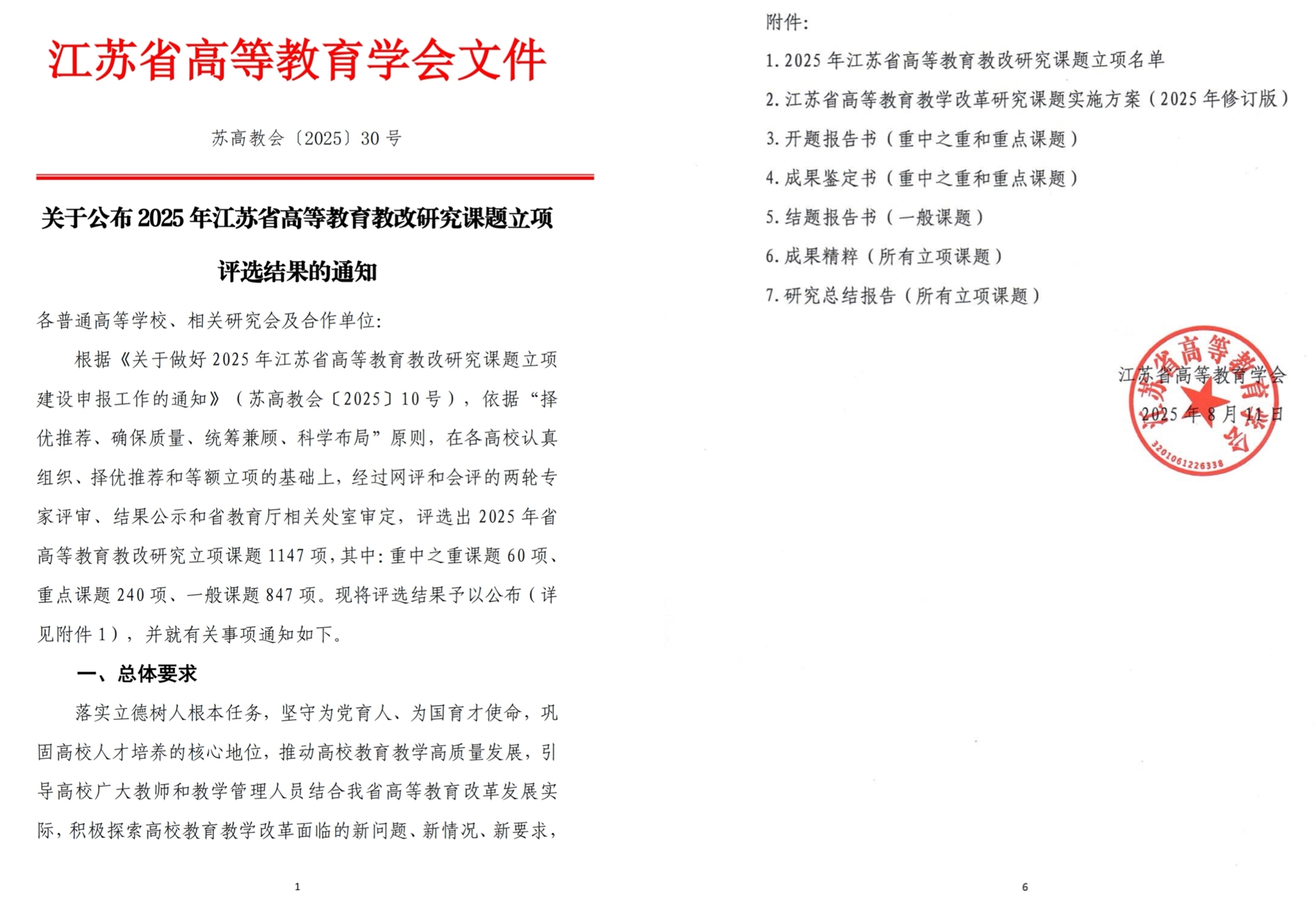 近日,从江苏省高等教育学会传来喜讯,av在线 在2025年江苏省高等教育教改研究课题申报中表现出色,推荐的4项课题成功获批立项。这一成绩的取得,彰显了学院在教育教学改革方面的积极探索与显著成效,也为学院进一步提升人才培养质量注入了新的动力。