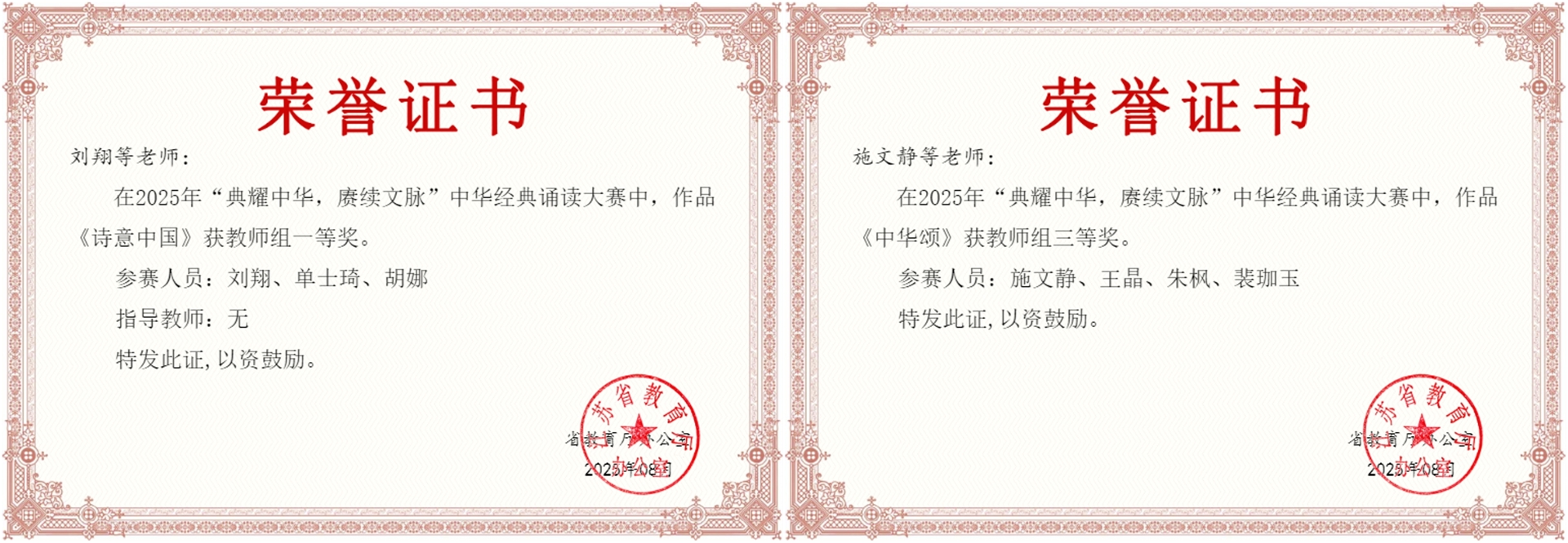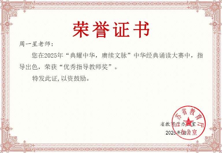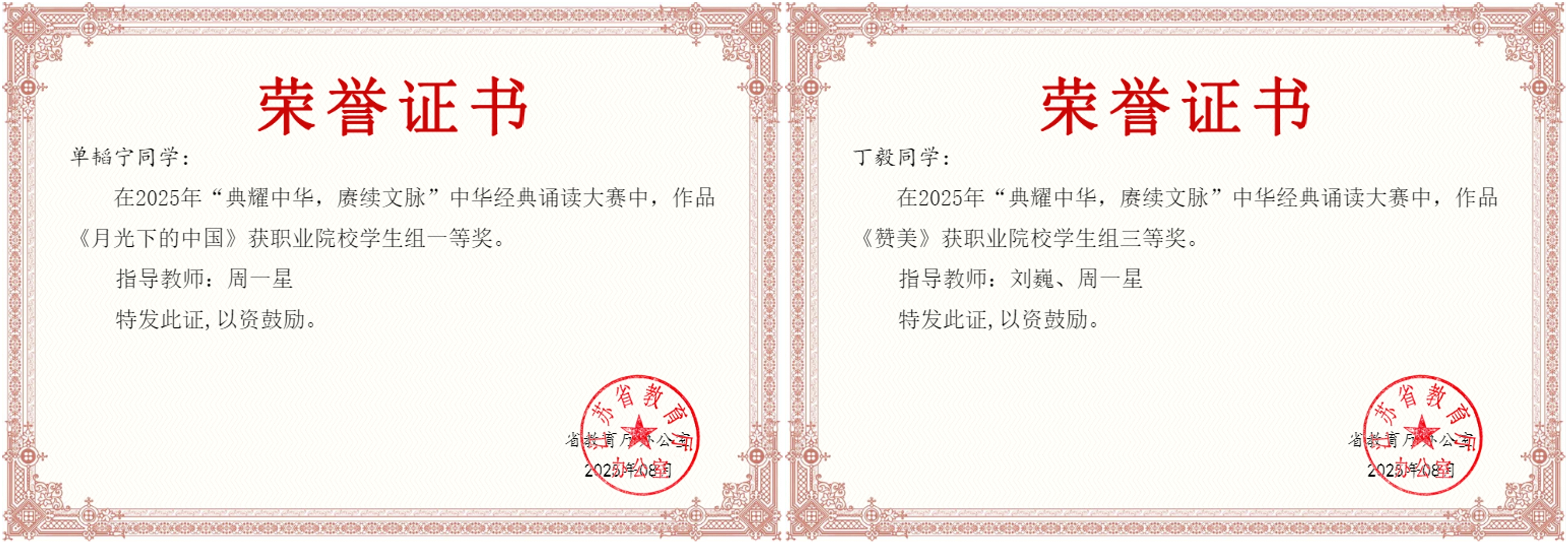 近日,2025年“典耀中华 赓续文脉”中华经典诵读大赛获奖结果公布。av在线 报送作品获职业院校学生组一等奖1项、三等奖2项、优秀奖1项,教师组一等奖1项、三等奖1项,其中两项一等奖作品入围国赛,周一星老师荣获优秀指导教师奖,所获成绩取得新突破。