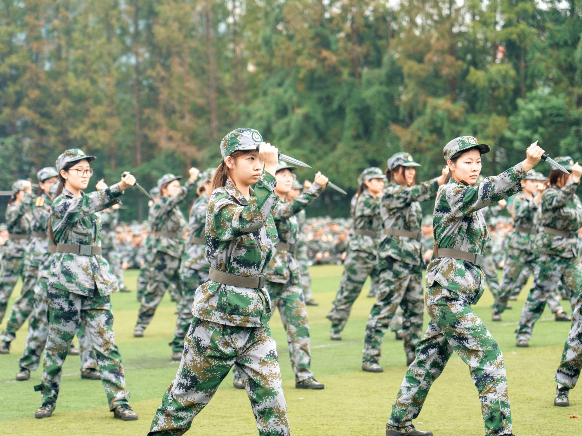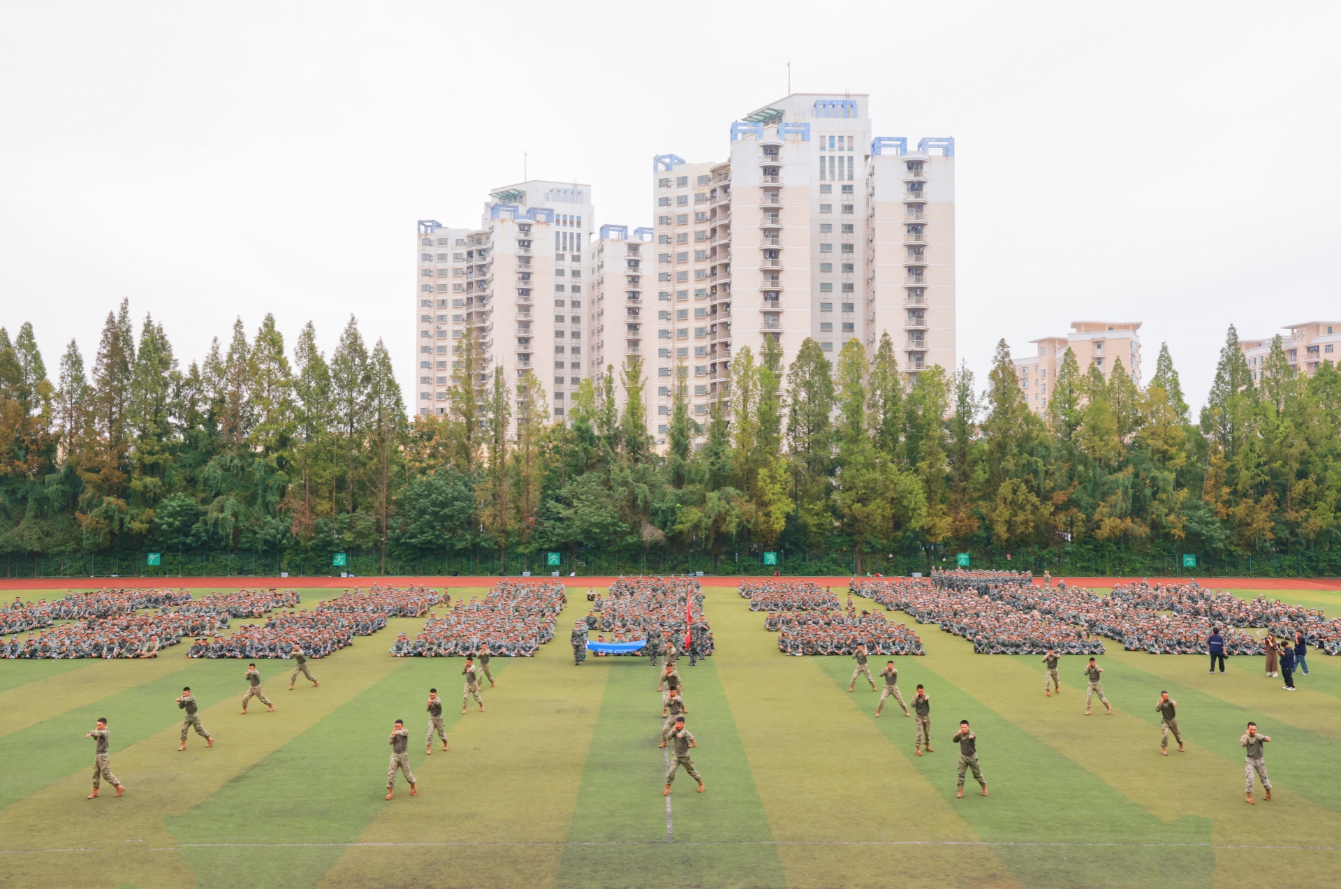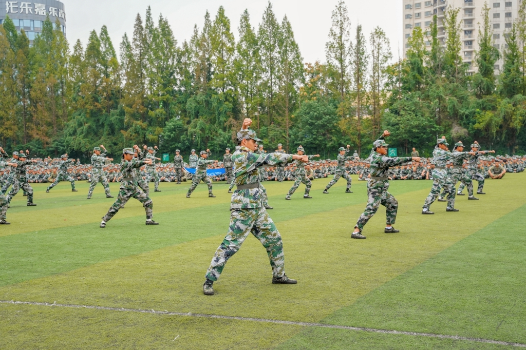 雄壮的国歌声中,军训成果汇报拉开序幕。在教官口令引导下,38个军训方阵昂首阔步以分列式行进,依次走过主席台接受检阅。坚毅的眼神、整齐的队列、挺拔的身姿和震天的口号,展现了参训学生昂扬的青春气息和良好的训练成果。