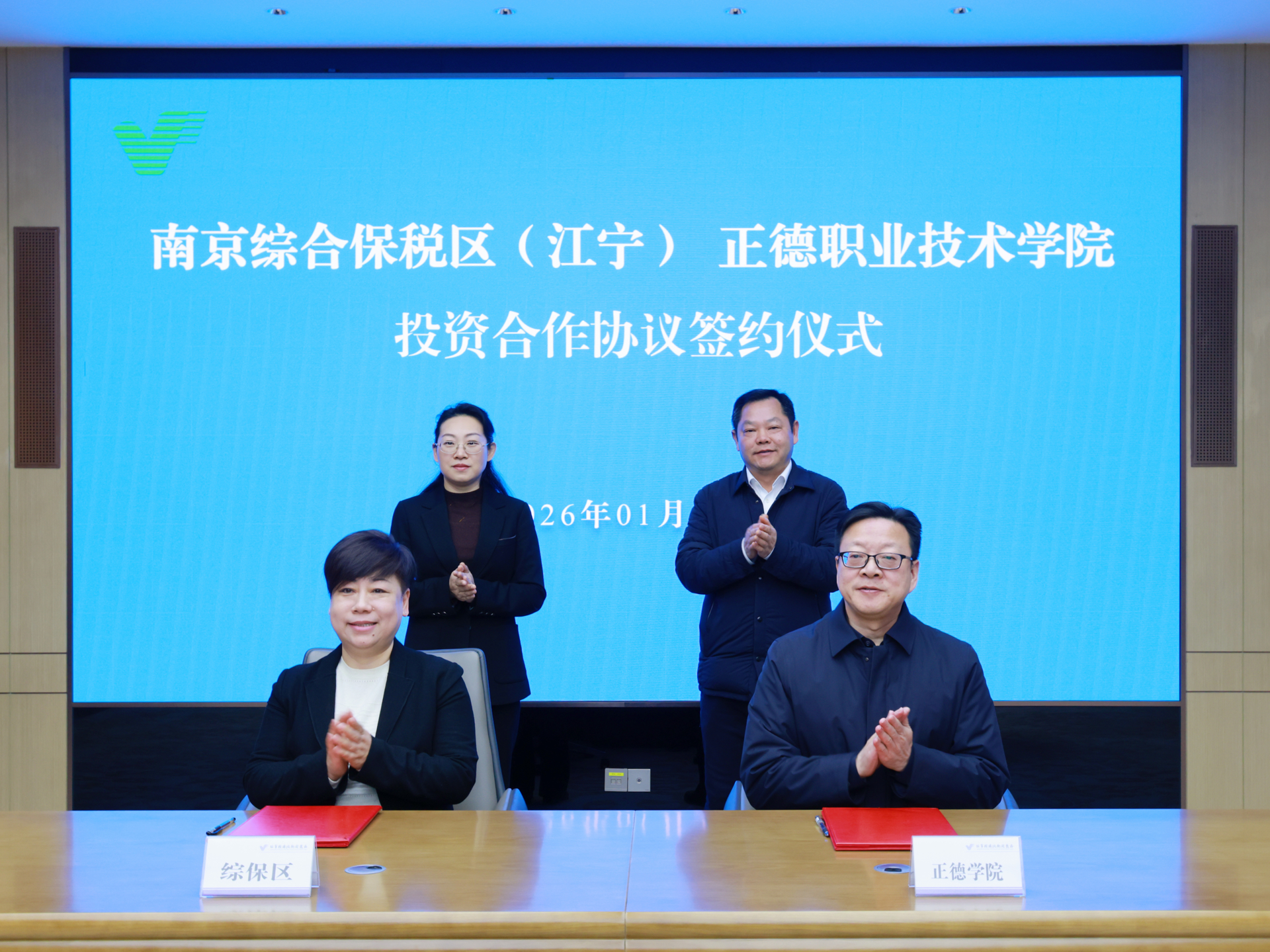强强联合赋能区域发展,校地协同共谱奋进新篇。2026年1月22日上午10时,南京综合保税区(江宁)(以下简称“综保区”)与av在线 (以下简称“正德学院”)投资合作协议签约仪式,在江宁开发区管委会大数据中心隆重举行。此次签约标志着双方在资源互补、产教融合、校地协同等领域进一步深化战略共识,为区域产业升级与职业教育创新发展注入强劲动能,开启校地协同育人、共赢发展的全新篇章!