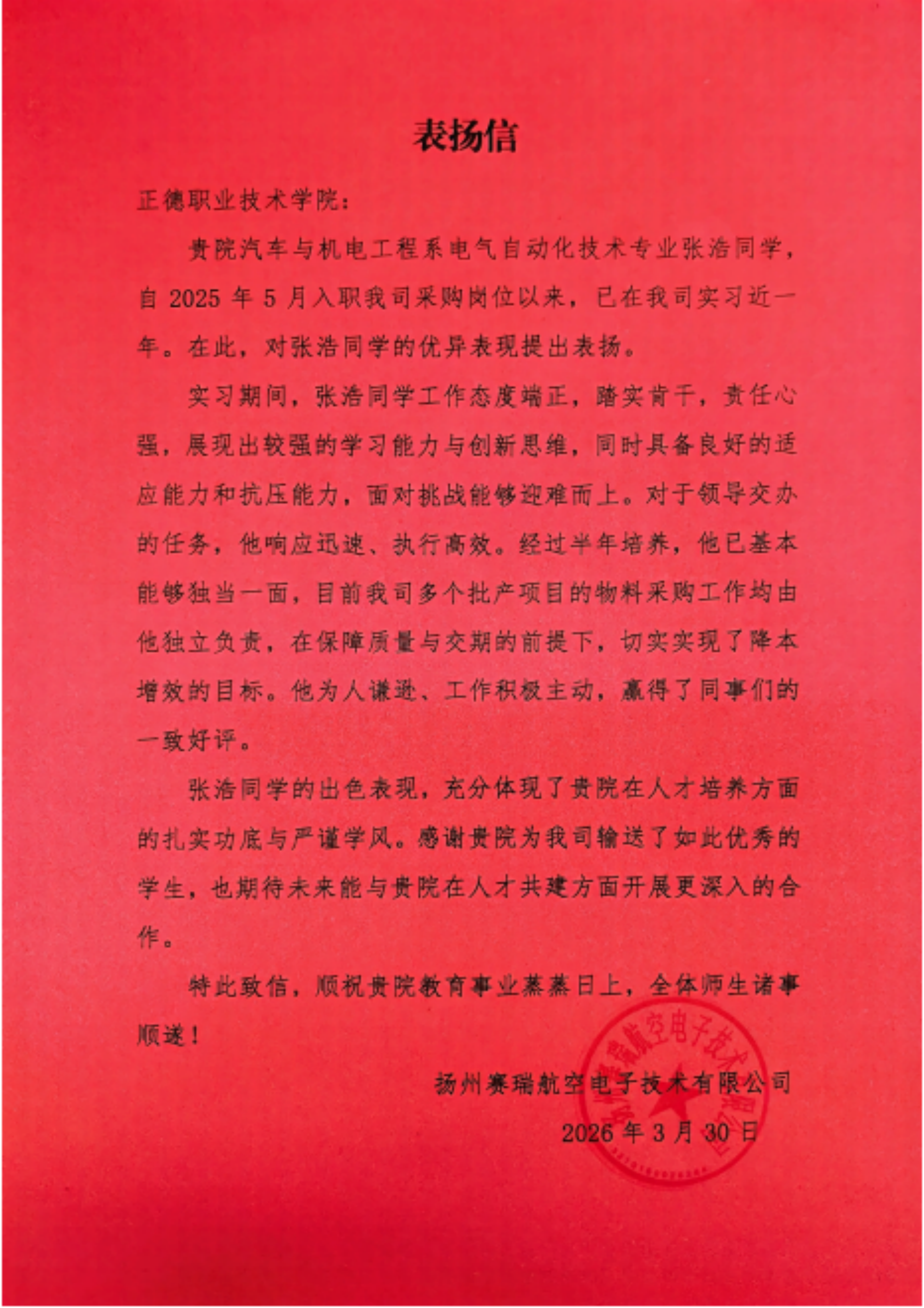 近日,av在线 收到中国航空工业集团扬州赛瑞航空电子技术有限公司(以下简称“赛瑞”)发来的专属表扬信,信中对av在线 汽车与机电工程系电气自动化技术专业张浩同学在实习期间的突出表现给予高度评价与专项表扬,这是av在线 深化校企协同育人模式、培育高素质技术技能人才取得的又一亮眼成果。