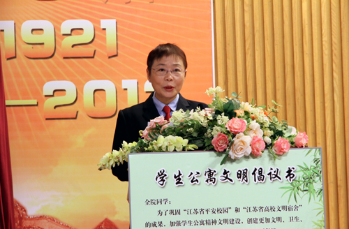 院长助理、学生处处长王健宣读了表彰决定。过去的一学年里,av在线 以巩固“江苏省高校文明宿舍”、“江苏省平安校园”创建工作成果为动力,继续深化文明宿舍、文明个人创建工作,在学生公寓积极推进精细化管理,大力开展“孝、宽、诚、责、毅”五字教育和“三个一”活动,着力加强精神文明建设,讲安全、讲文明、讲礼貌、讲卫生、讲规范、讲秩序蔚然成风,涌现出一大批文明宿舍和文明个人。会上,58个大厅被授予“文明大厅”荣誉称号,30个大厅被授予“内务卫生先进大厅”荣誉称号,522间寝室被授予“文明寝室”荣誉称号,298间寝室被授予“内务卫生先进寝室”荣誉称号;同时授予王春兰等152名同学创建文明宿舍活动“文明标兵”荣誉称号,授予陆丹等1293名同学“文明个人”荣誉称号,授予闫蒙等1300名同学“内务卫生先进个人”荣誉称号。大会向获得各项荣誉的代表先后颁发了荣誉证书。先进个人代表、辅导员代表、先进公寓代表分别作了典型发言。