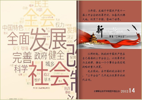 为了向广大读者深入宣传党的十八届三中全会精神,积极配合全院师生理论学习活动深入开展。图书馆利用自办的电子刊物《校园生活导报》,以详实丰富的内容,生动活泼的形式,提前刊出聚焦十八届三中全会特刊。