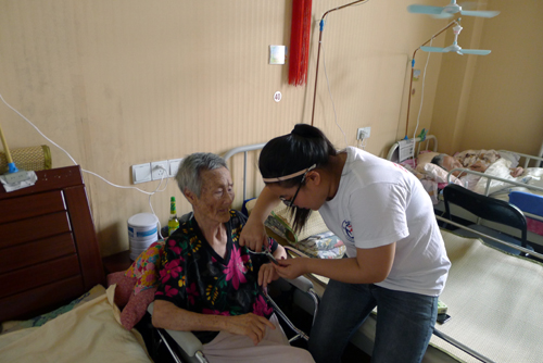经济与管理系“夕阳红”暑期社会实践小分队同学帮老人剪指甲(资料图片)