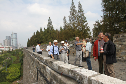 早上8:20,老同志们相约学院,共同乘车出发,前往登高始发点—神策门。一路上大家欢声笑语,交流气氛十分热烈,登上城墙,大家一路步行至玄武门,老同志们目睹且感受到了南京这座养育我们的城市处处日新月异的变化,为之精神振奋、心情愉快。老领导戴明桢老师,在事前做了精心细致的考虑,游玩中他主动担任“导游员”,为大家讲解景点历史由来,风趣而生动的语言带给同行的老同志们许多欢乐。老领导、老同志们在景区纷纷合影留念,畅叙友情。