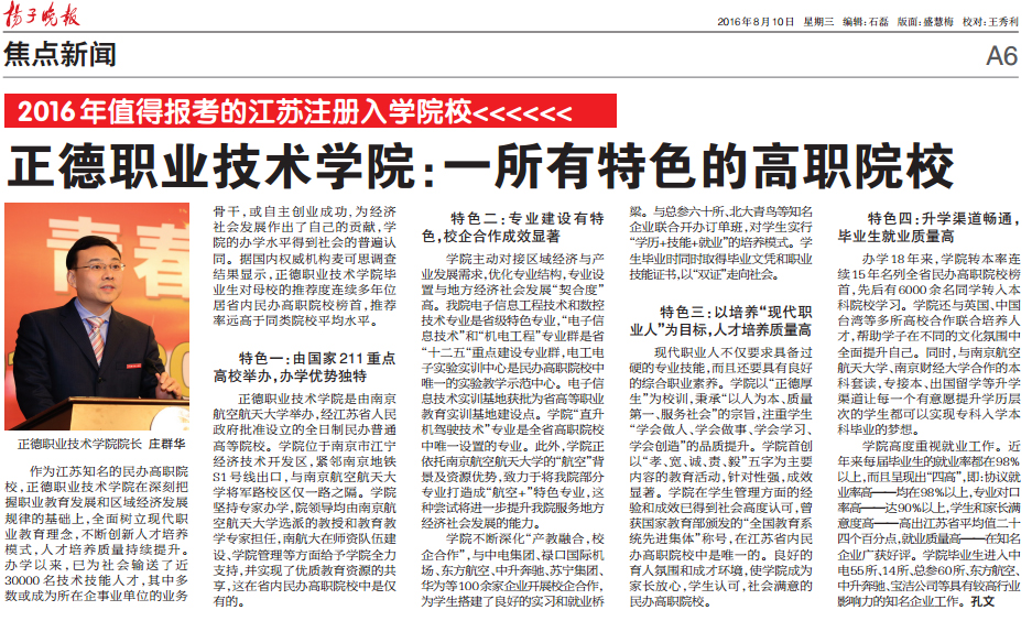 现代职业人不仅要求具备过硬的专业技能,而且还要具有良好的综合职业素养。学院以“正德厚生”为校训,秉承“以人为本、质量第一、服务社会”的宗旨,注重学生“学会做人、学会做事、学会学习、学会创造”的品质提升。学院首创以“孝、宽、诚、责、毅”五字为主要内容的教育活动,针对性强,成效显著。学院在学生管理方面的经验和成效已得到社会高度认可,曾获国家教育部颁发的“全国教育系统先进集体”称号,在江苏省内民办高职院校中是唯一的。良好的育人氛围和成才环境,使学院成为家长放心,学生认可,社会满意的民办高职院校。